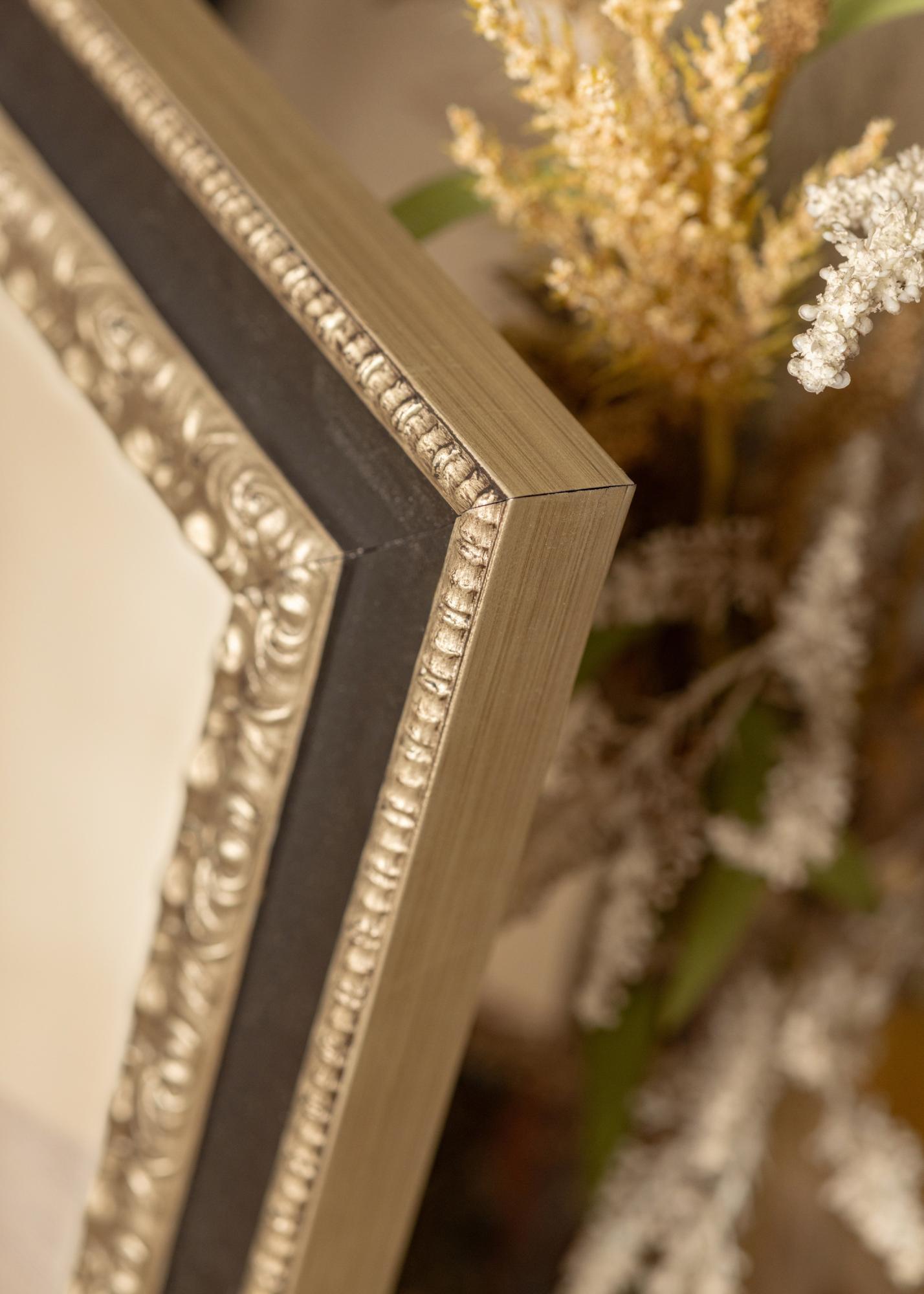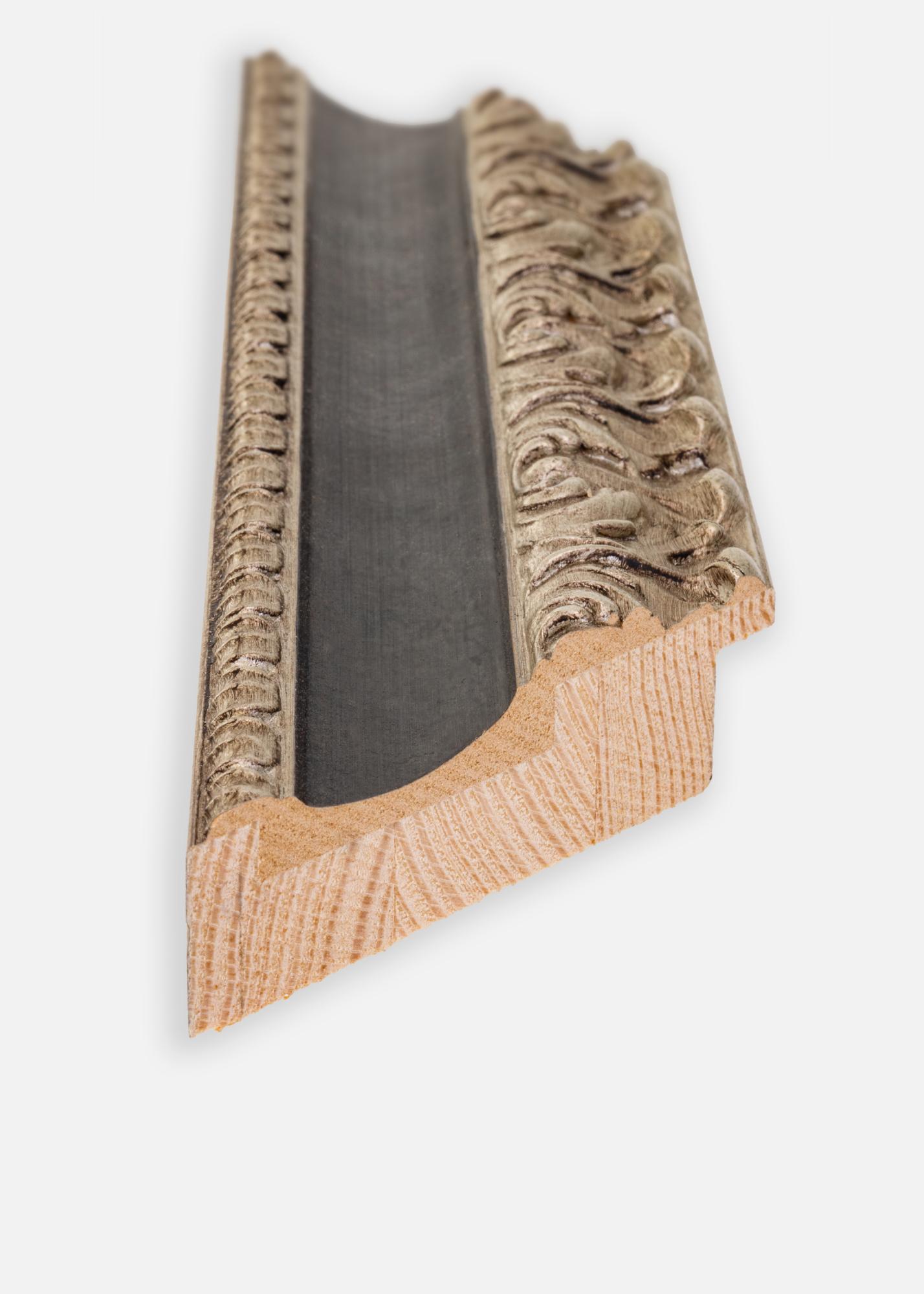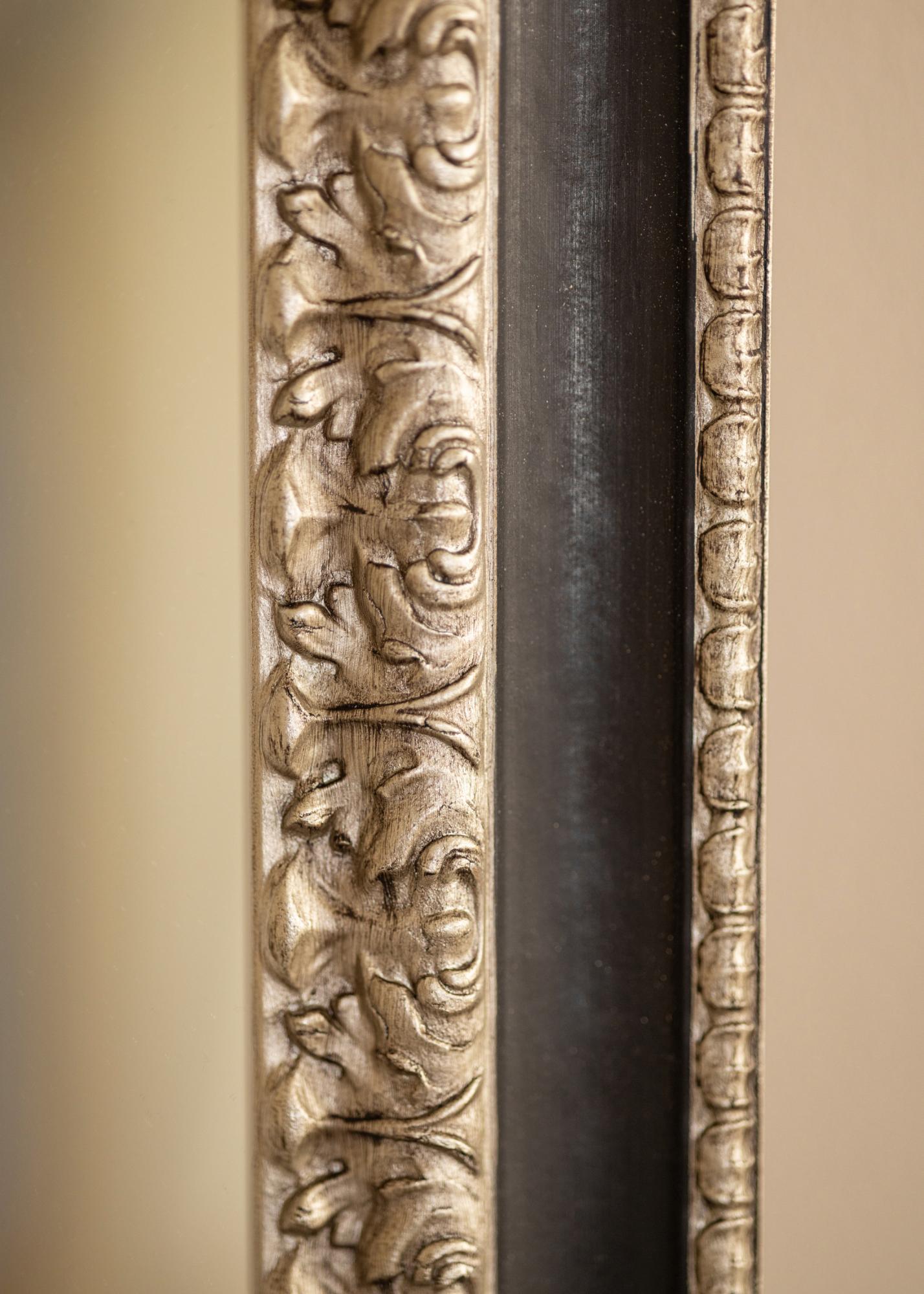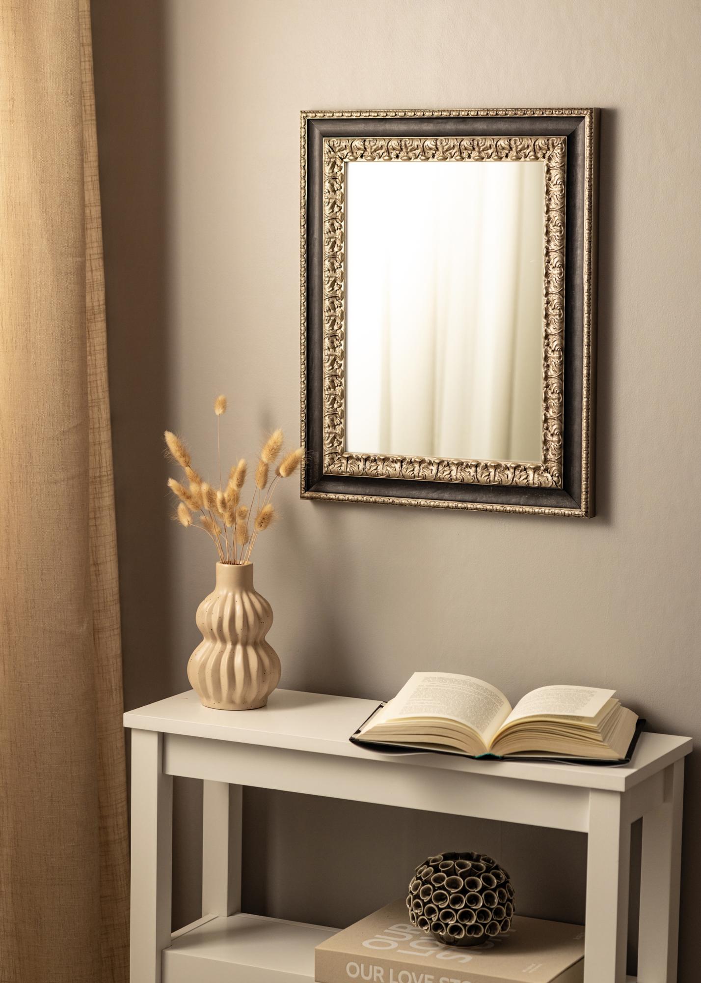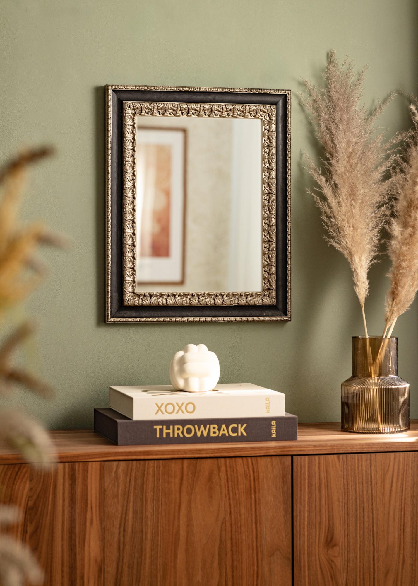 "Drottningholm Argent" est un beau miroir de style retro provenant d'Italie en pin jointé et peint à la main. Le miroir a un profil argenté richement décoré avec un large bord noir qui donne au cadre son aspect élégant.