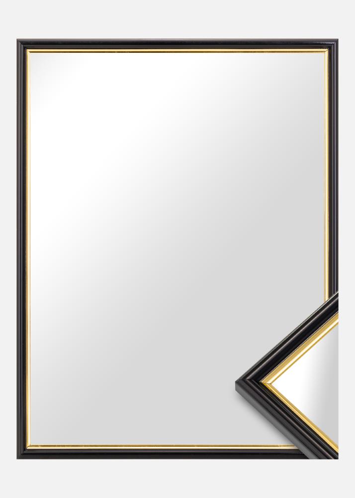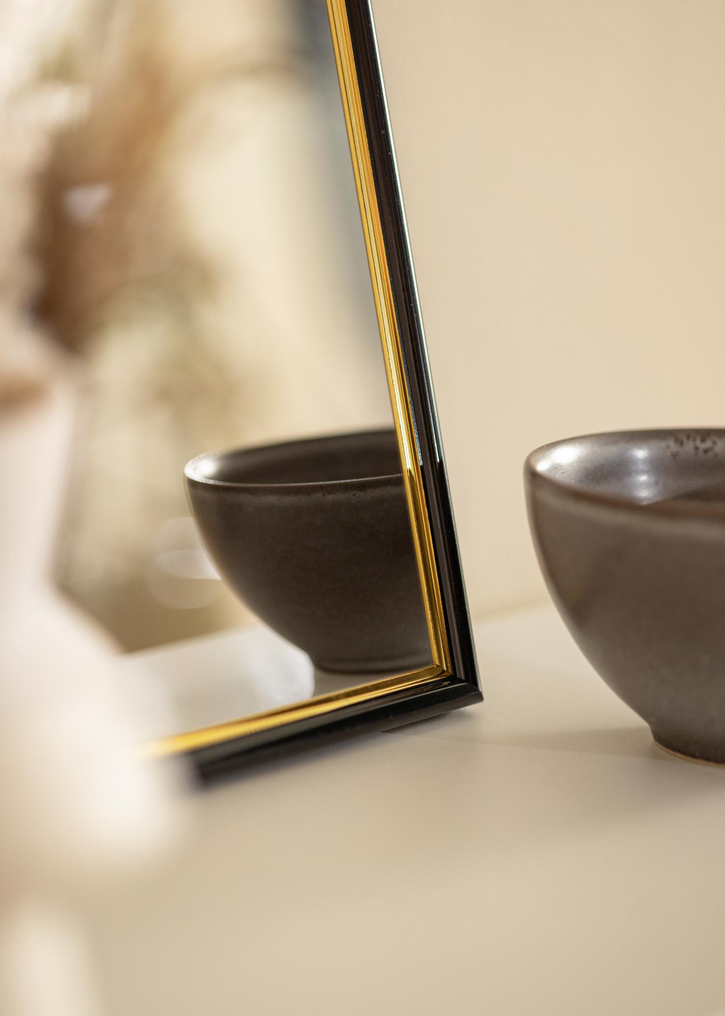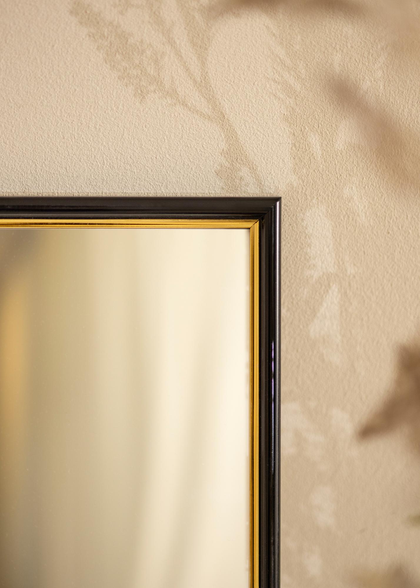Changez d'ambiance dans le hall d'entrée, la salle de bain ou le salon en accrochant ce miroir luxueux ! Le miroir est noir avec une partie dorée proche du verre. Les couleurs se marient bien avec les détails intérieurs, par exemple, noir, or, violet ou pastel. Parce qu'il est conçu selon vos souhaits, vous pouvez être certain qu'il s'adaptera parfaitement là où vous le souhaitez.