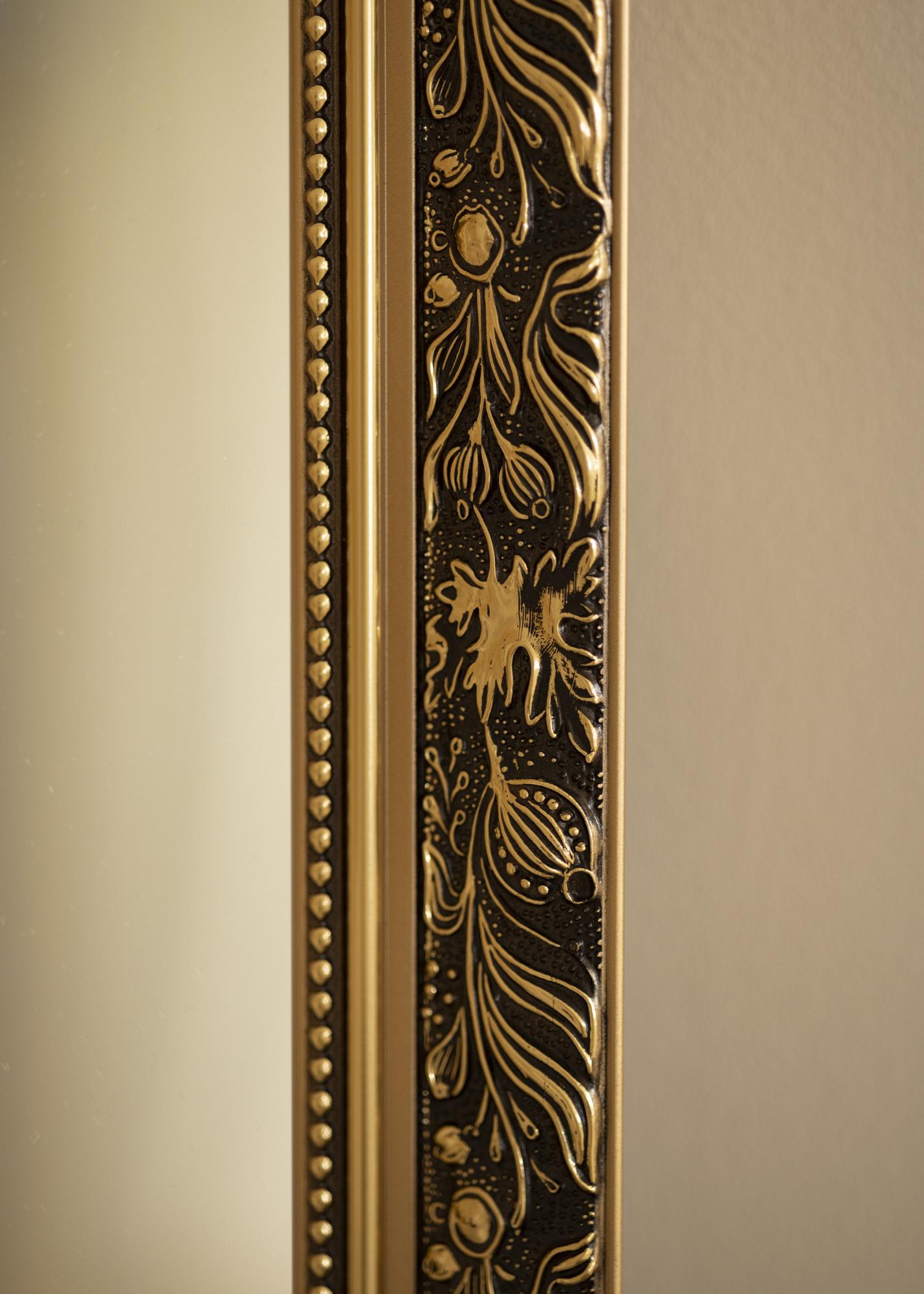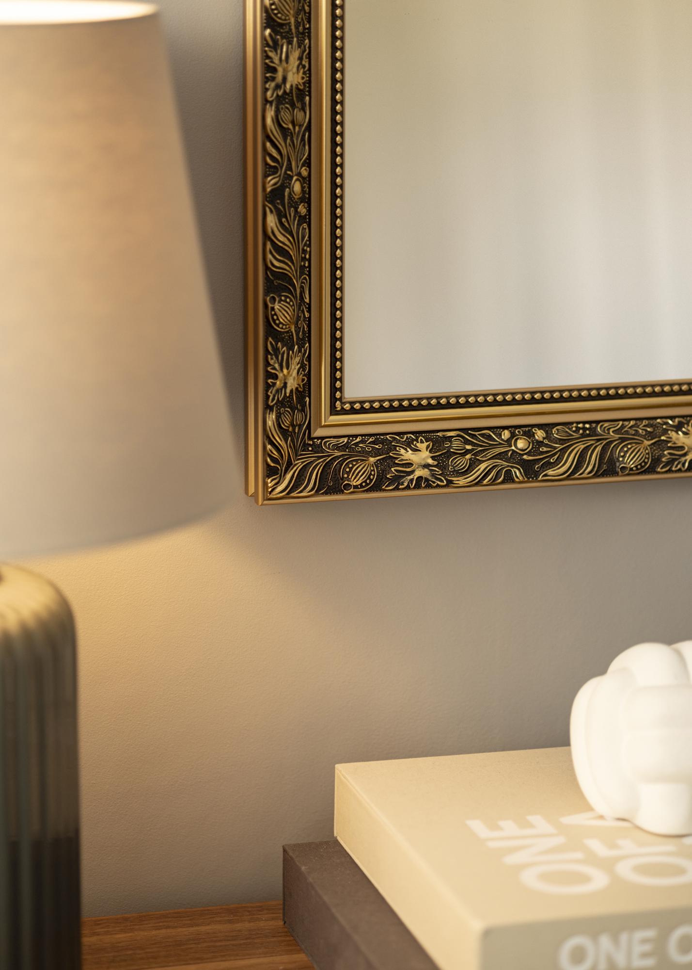 Créez une sensation accueillante et luxueuse là où vous choisissez de placer ce magnifique miroir ! Le miroir a un cadre au design romantique avec un motif à volutes, des bords droits et des rubans de perles à de différents niveaux. La couleur dorée se marie parfaitement avec d'autres détails intérieurs en or, couleurs pastel, noir et blanc !