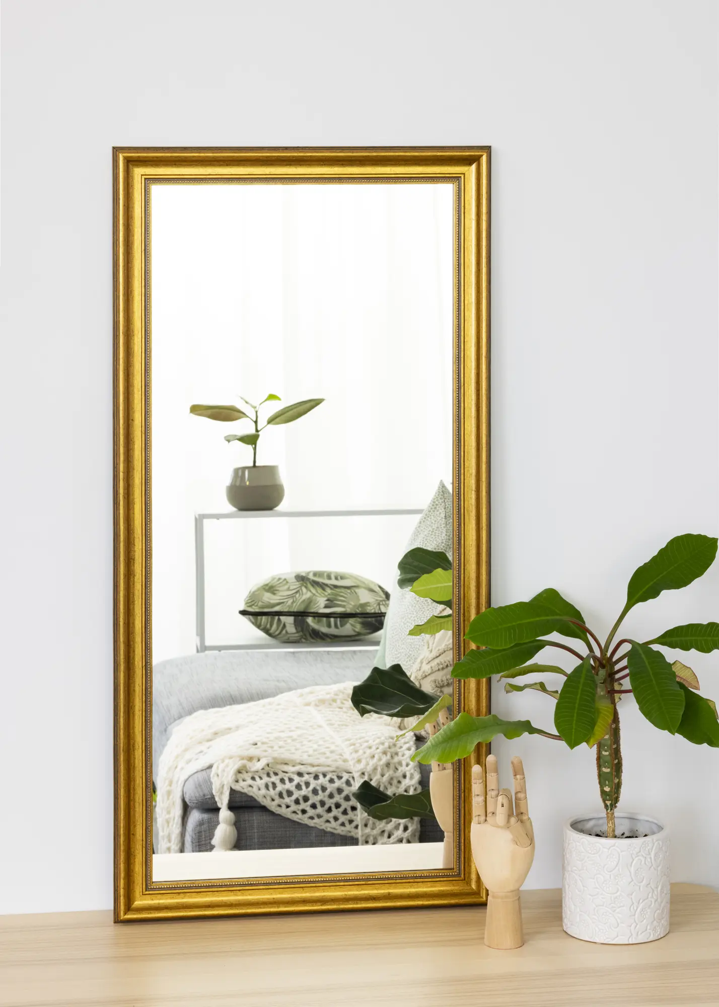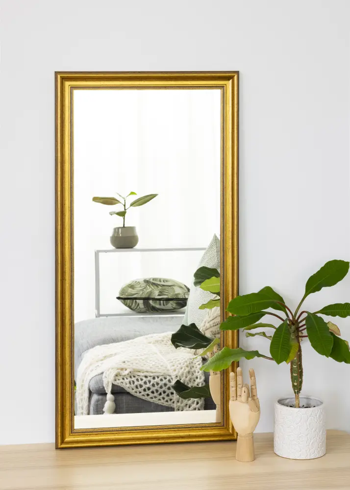 Ce miroir rectangulaire a un beau cadre de couleur or dans un style classique. Le miroir a une apparence chaleureuse et élégante et peut décorer le mur dans n'importe quelle pièce.