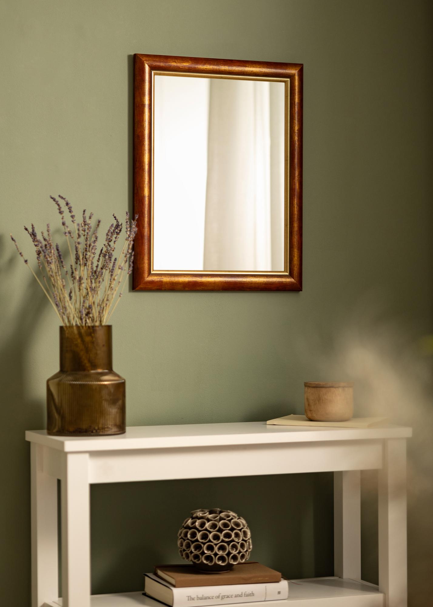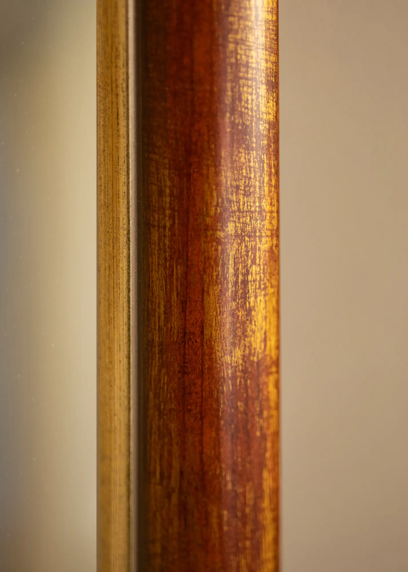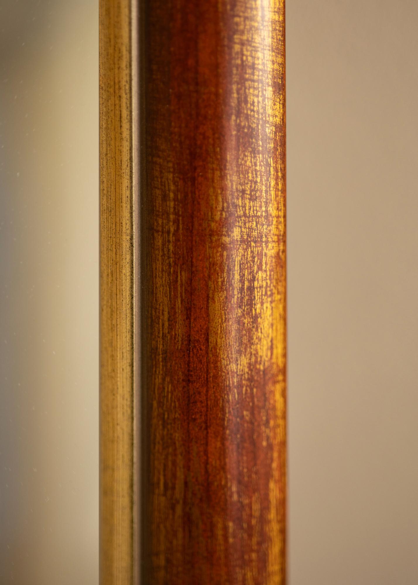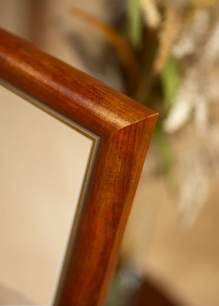 Bordure en bois intemporelle fabriquée en Finlande avec une belle surface en bois de teinte rouge et au bord doré au plus proche du verre miroir. Le cadre a un profil large de 41 mm et une profondeur de 19 mm, ce qui donne une profondeur supplémentaire à votre miroir.
