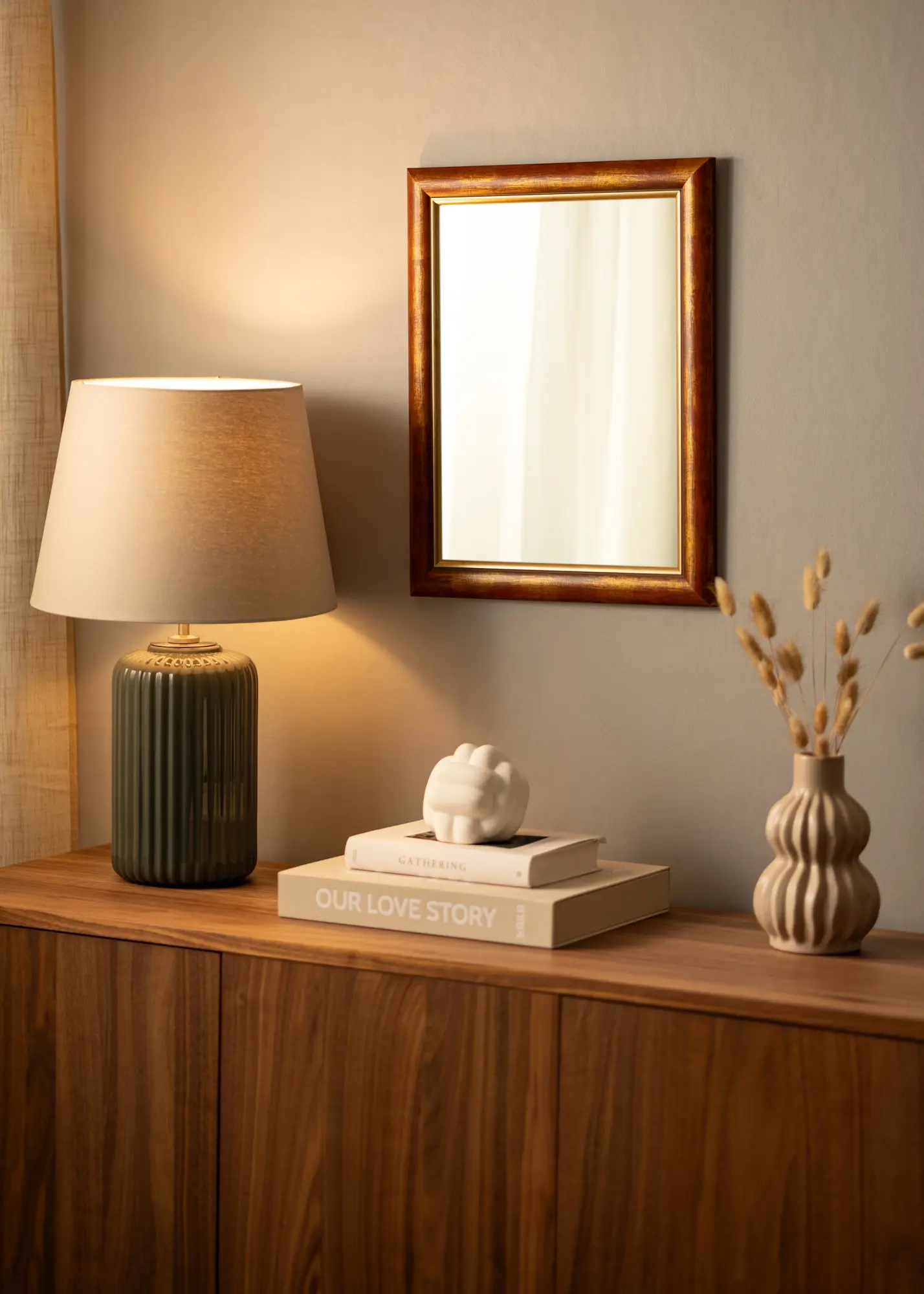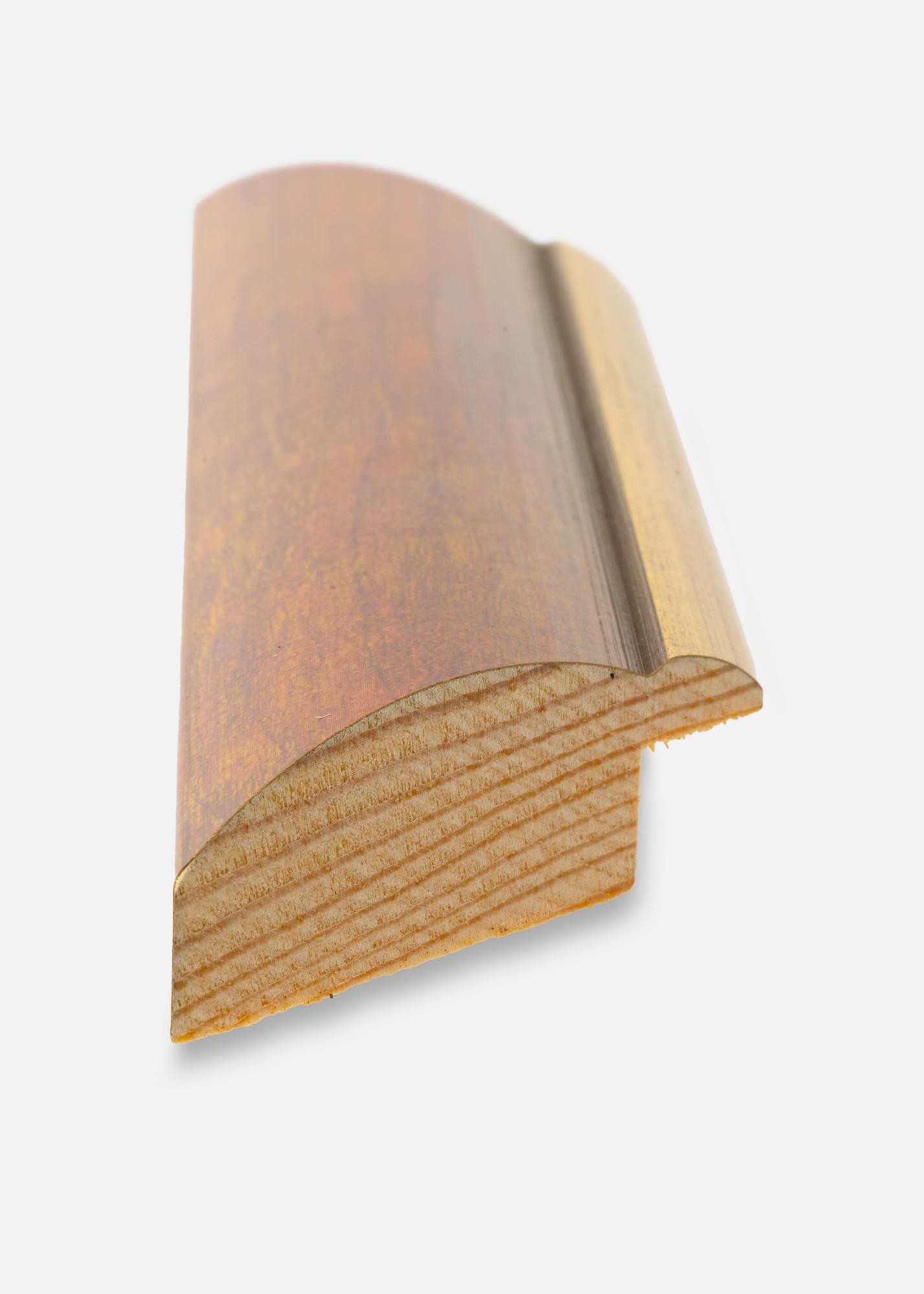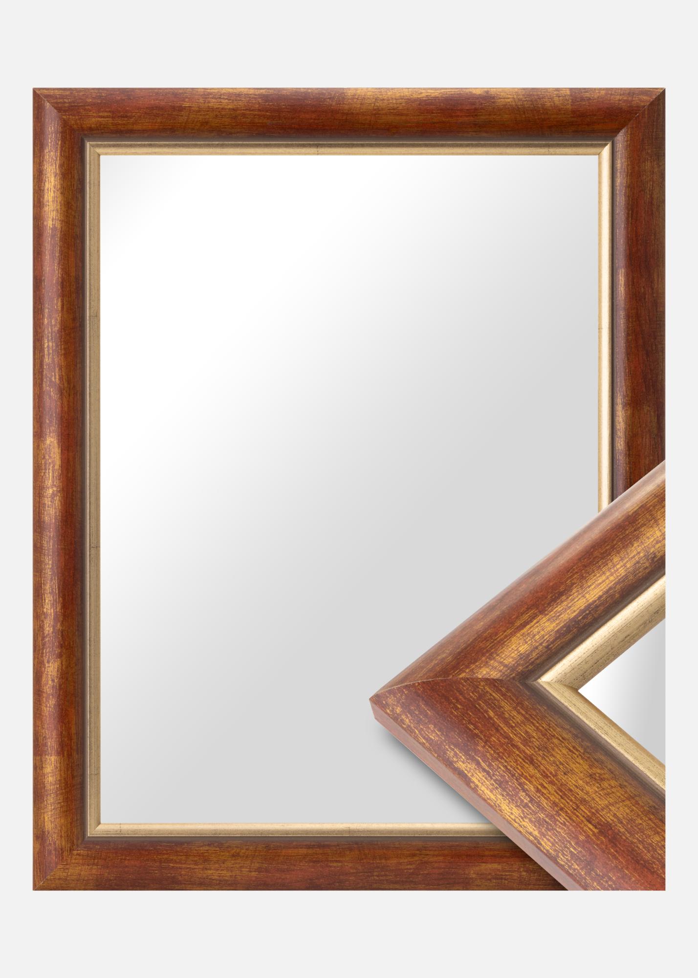 Bordure en bois intemporelle fabriquée en Finlande avec une belle surface en bois de teinte rouge et au bord doré au plus proche du verre miroir. Le cadre a un profil large de 41 mm et une profondeur de 19 mm, ce qui donne une profondeur supplémentaire à votre miroir.
