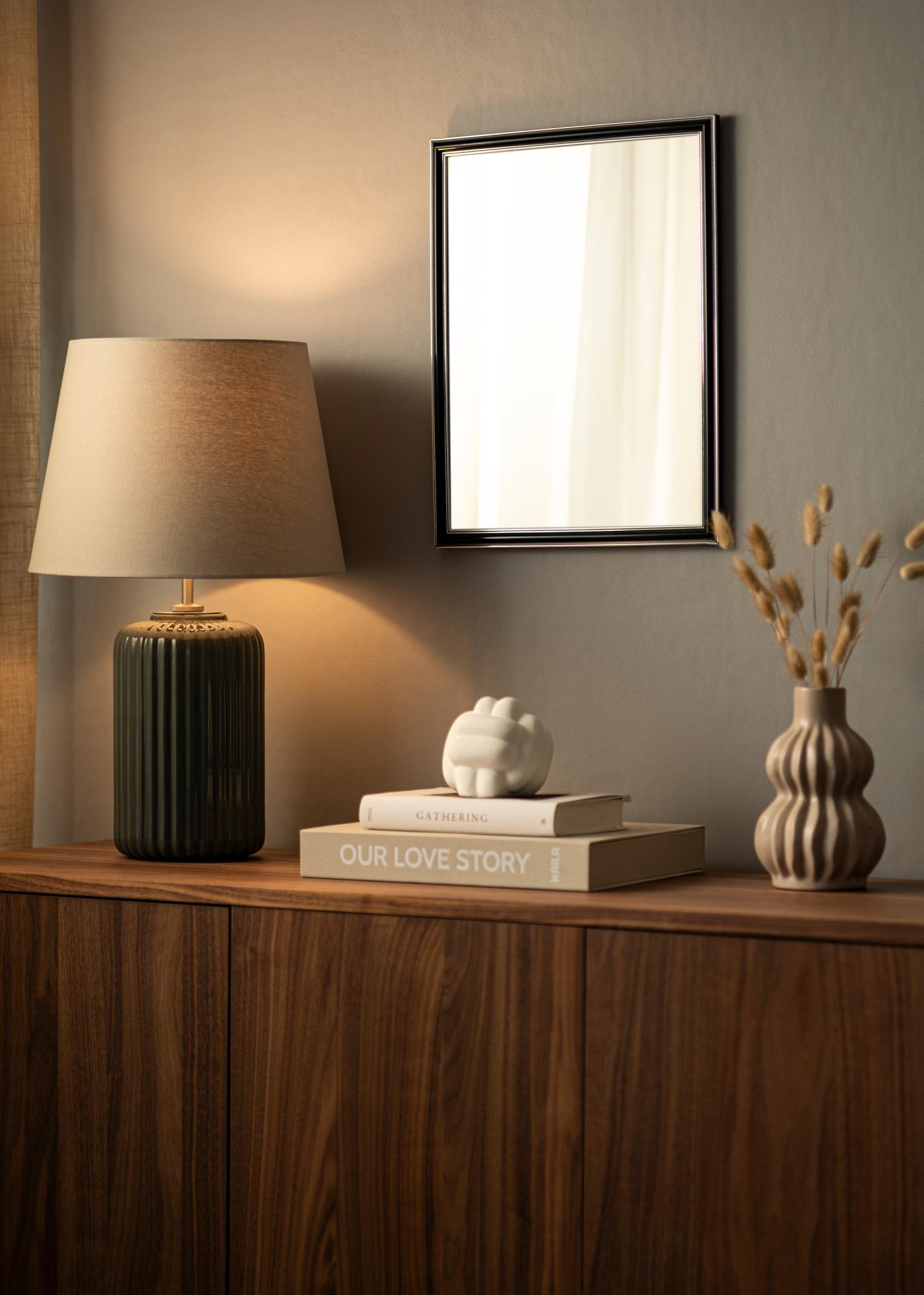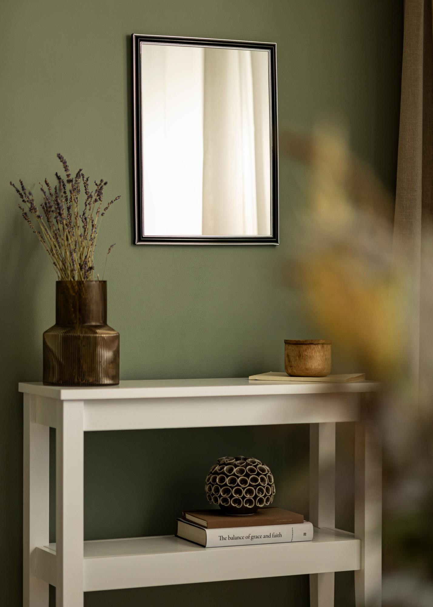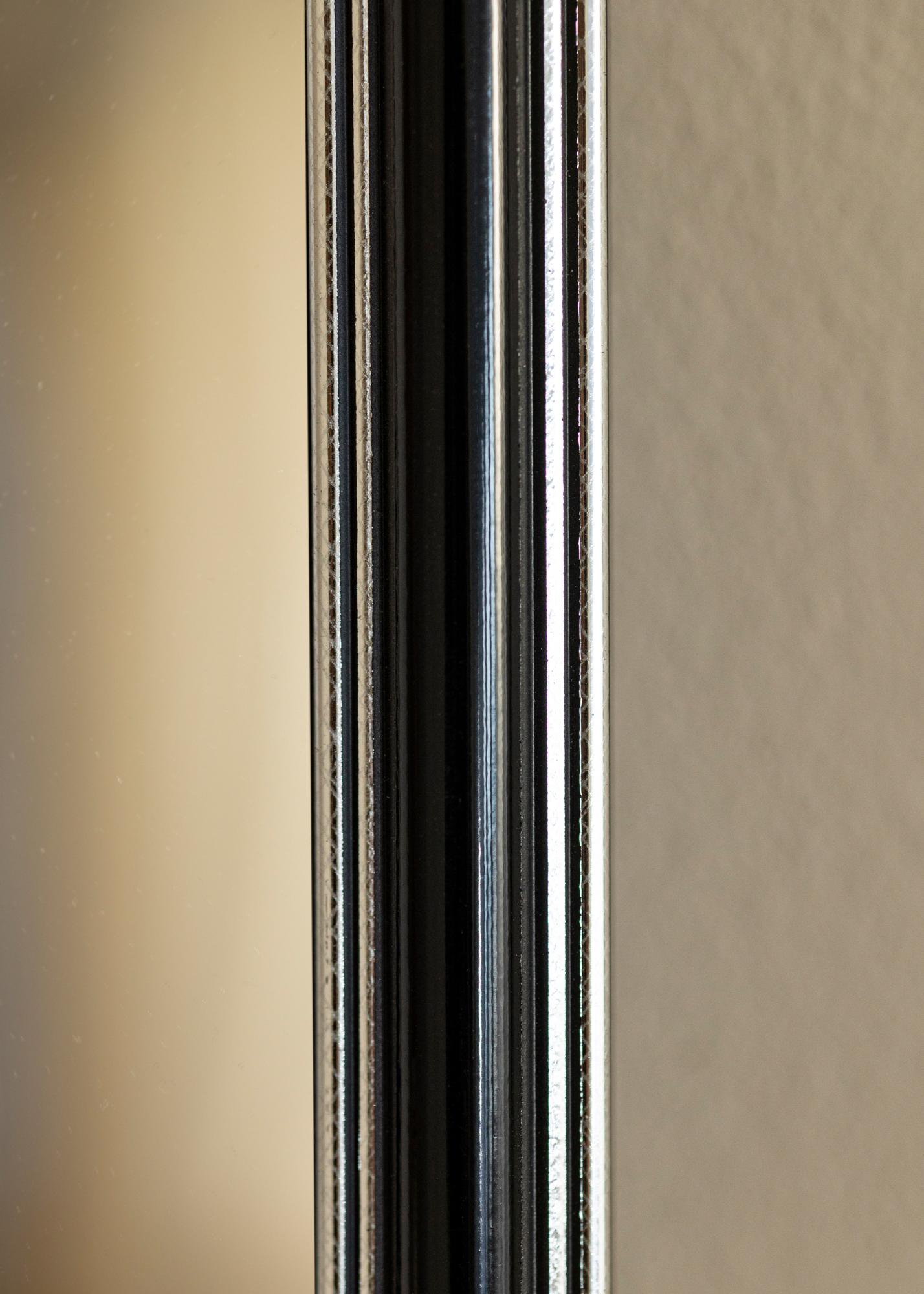 Procurez-vous un beau miroir qui s'adaptera assurément là où vous le souhaitez ! Ce miroir luxueux est fabriqué selon vos mesures dans notre propre atelier d'encadrement. La partie centrale noire avec des bords de couleur argent à l'extrémité et au plus proche du verre ajoute une touche masculine. S'associe facilement avec d'autres meubles, par exemple en argent, noir, blanc et violet.