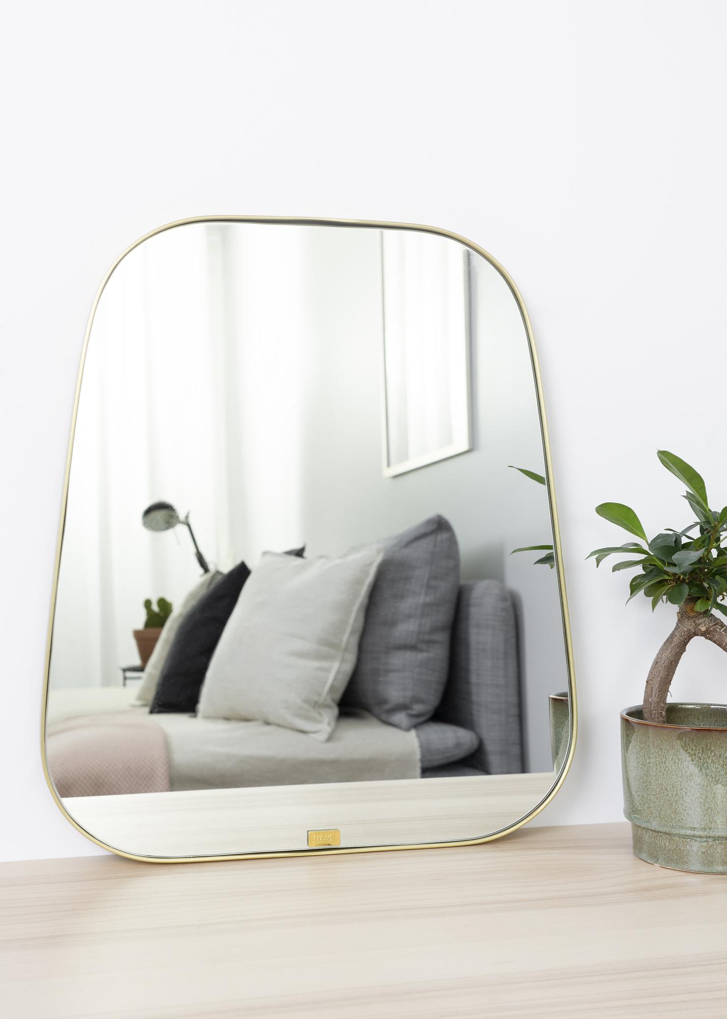 Un miroir mural qui se démarque des autres ! Avec sa forme jolie et créative, ce miroir est un élément d'intérieur parfait pour la plupart des maisons - et la plupart des pièces. Le miroir est entouré d'un cadre en laiton fin et épuré, ce qui lui donne une apparence élégante.