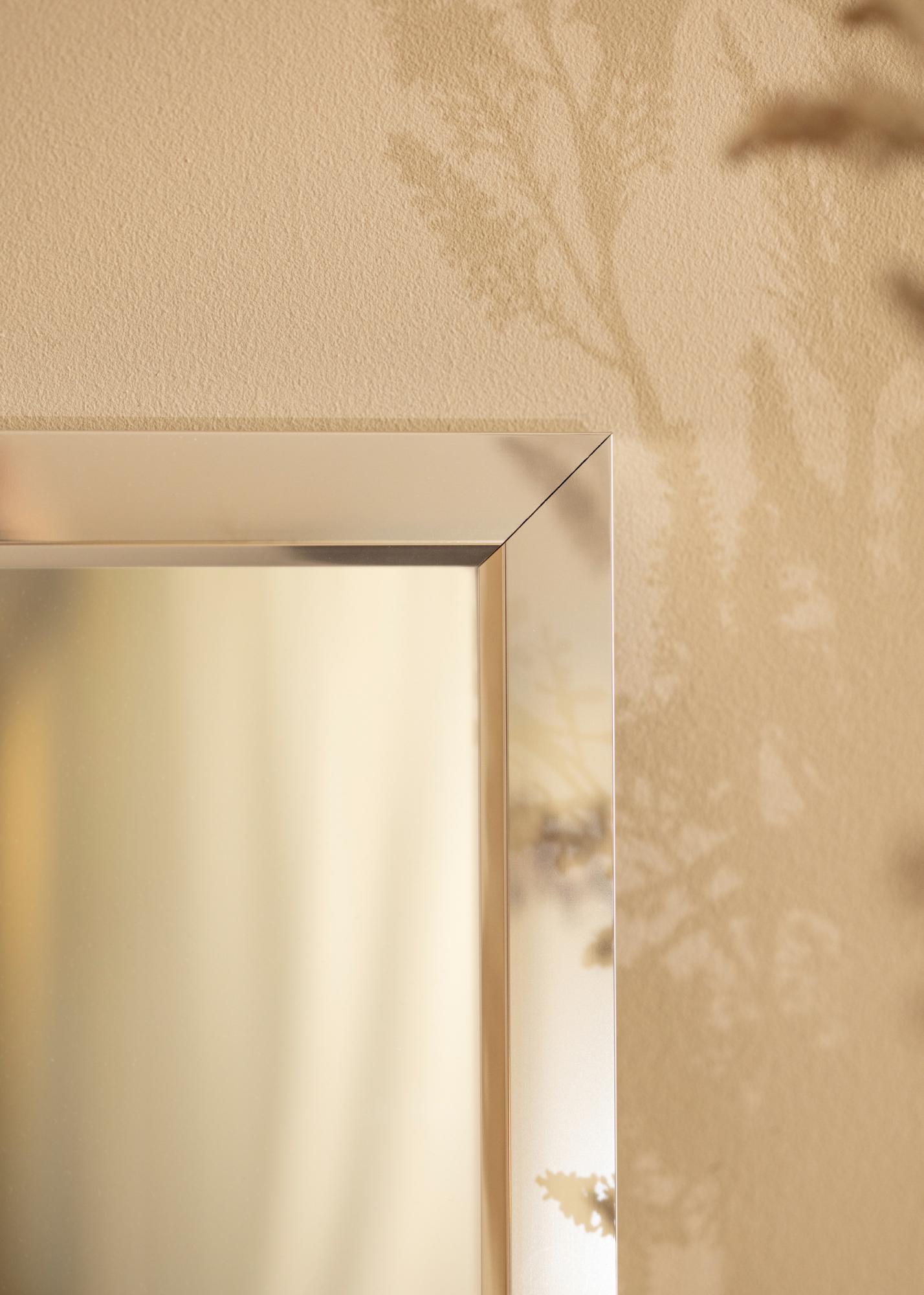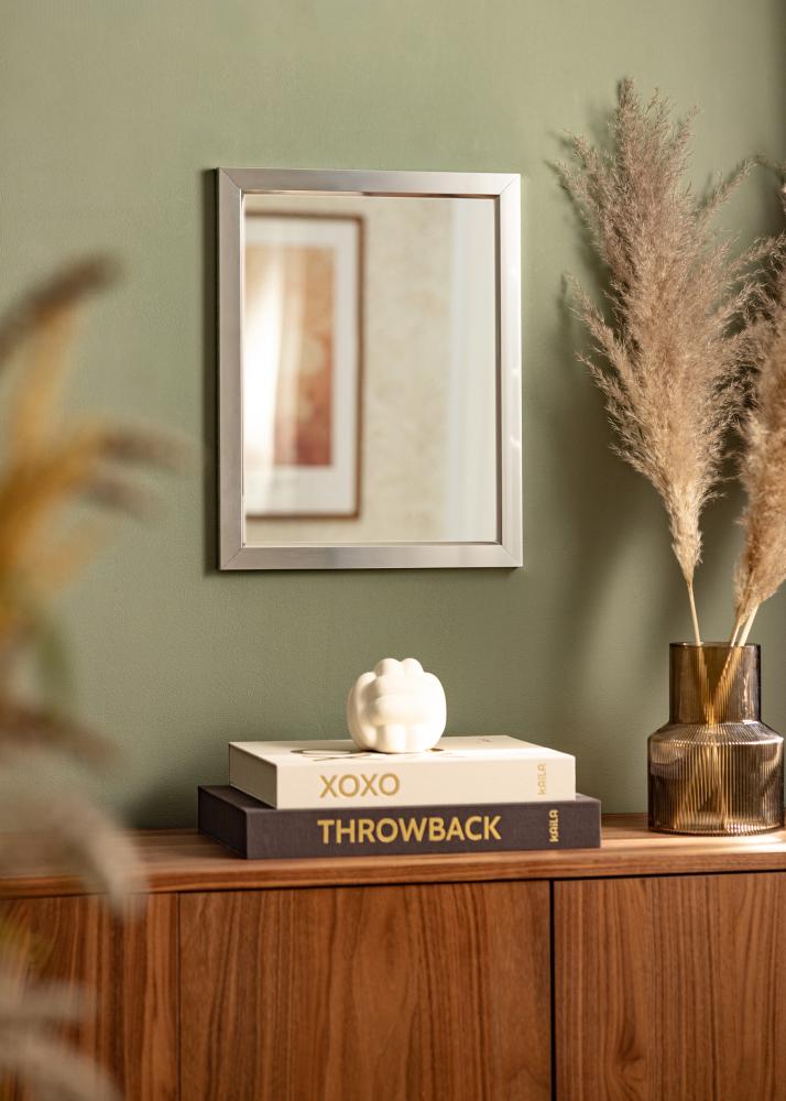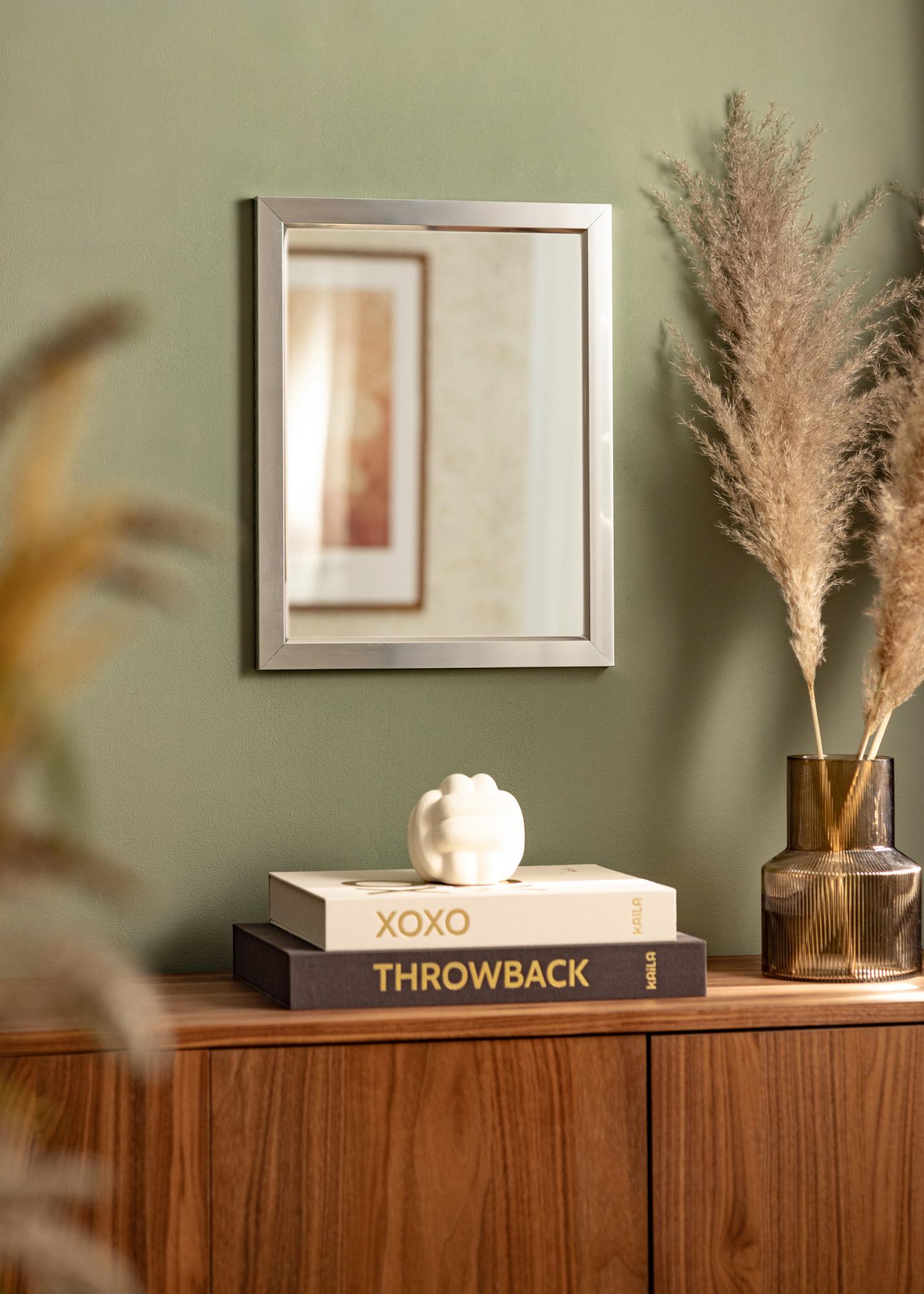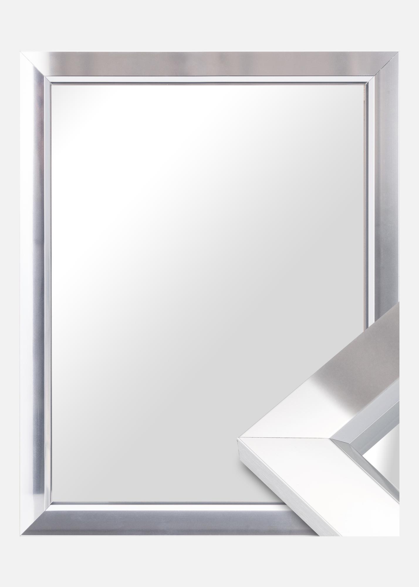 Charmant et sympathique miroir avec un cadre argenté brillant avec un effet de verre miroir. Le cadre en aluminium est conçu en Allemagne et est de haute qualité. L'aspect brillant du cadre du miroir attire le regard et réfléchit la lumière de manière efficace, ce qui est bien si vous souhaitez utiliser le miroir pour illuminer une pièce sombre. La forme au design net du miroir s'intègre bien dans les intérieurs modernes minimalistes et dans les maisons où vous mélangez à la fois neuf et de l'ancien.