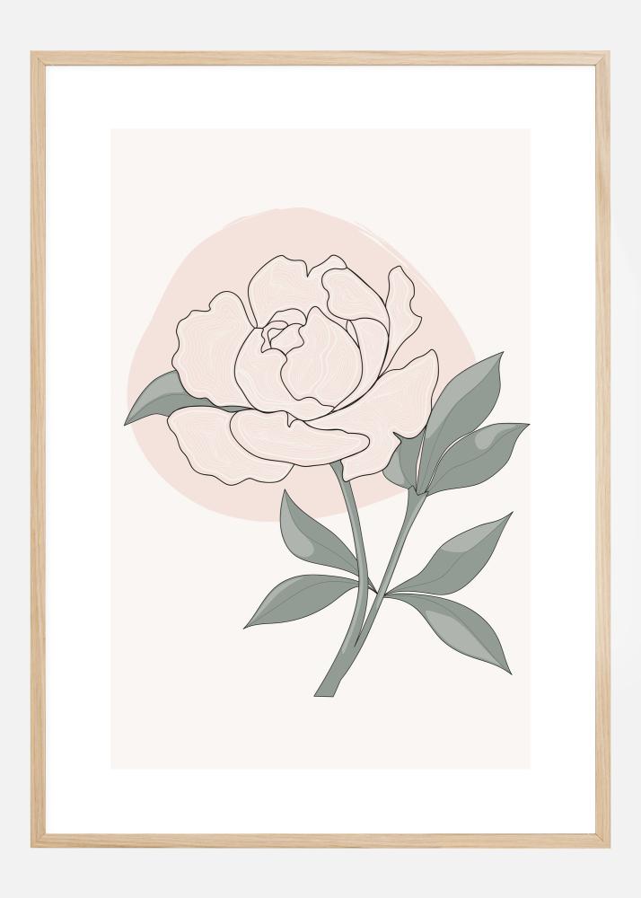 Une affiche artistique d'une tige de pivoine avec une fleur rose. Sur un fond beige, la fleur rose est placée sur une forme de couleur pêche, tandis que les feuilles ont été soulignées en noir. Apportez la délicatesse de cette fleur dans votre maison.