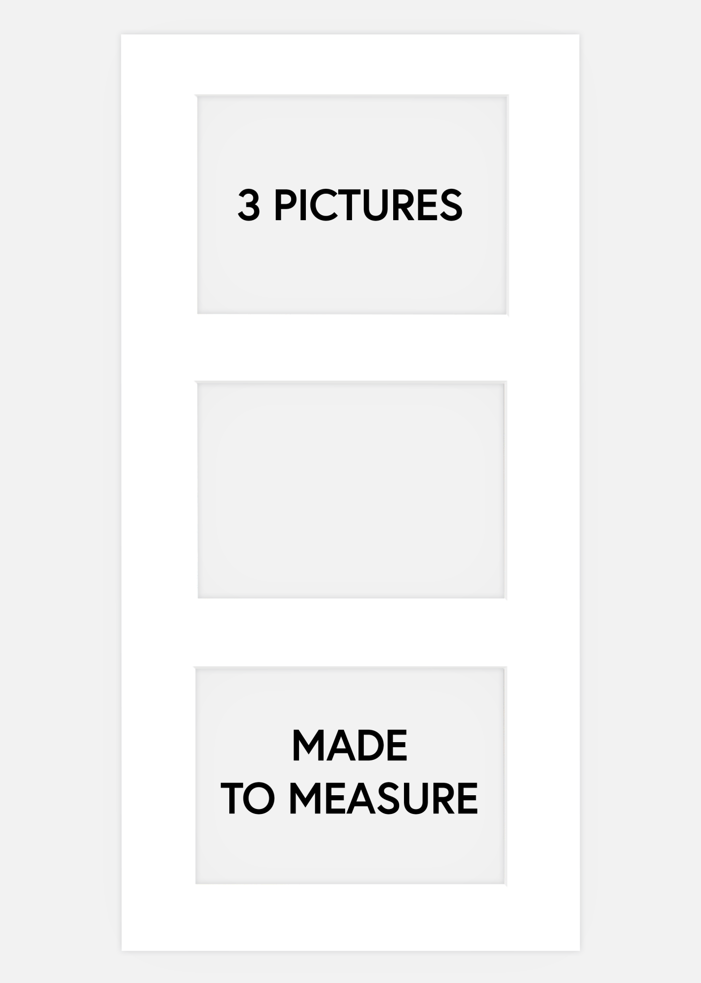 Vous pouvez ici commander facilement des passe-partout de collage avec de la place pour 3 photos. Pour commander, entrez les dimensions extérieures du passe-partout (qui doivent être les mêmes dimensions que le cadre que vous allez utiliser), puis entrez les dimensions intérieures souhaitées, qui doivent toujours être 1 cm plus petites que les images que vous allez utiliser. Vous ne pouvez commander ici que si vous avez deux photos de la même taille ; si vous souhaitez un passe-partout de collage plus avancé, vous devez contacter notre service client pour votre commande.