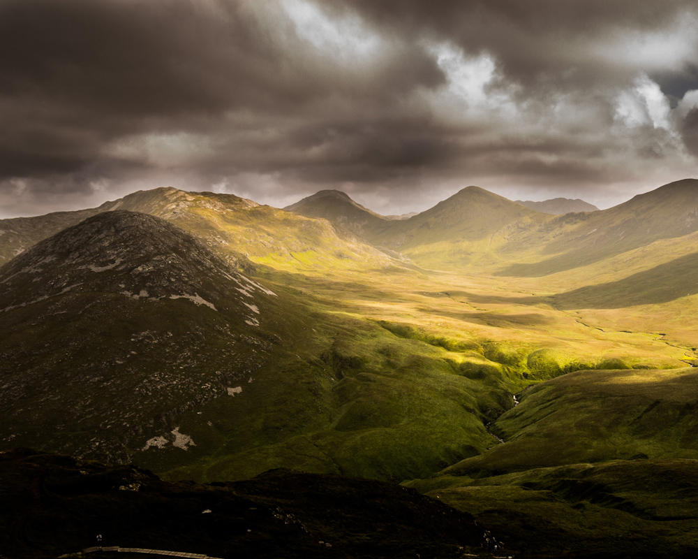 Portrait de paysage dramatique avec des nuages d'orage qui se dressent au-dessus d'une chaîne de montagnes tandis que le soleil illumine la vallée en dessous. Les couleurs sourdes et atténuées soulignent le caractère dramatique de l'image et font que la photographie se démarque vraiment. Convient le mieux dans un cadre qui met en valeur la profondeur de l'image et ne détourne pas l'attention du sujet.