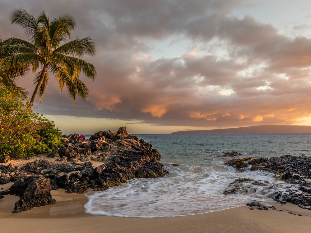 Une plage au coucher du soleil, un beau cliché qui est un must pour le nerd de tiki ou le thème tropical. Des posters avec le palmier classique qui se penche sur le bord de la plage dans les derniers rayons dorés du soleil. La photographie est belle dans un cadre avec un aspect vieilli ou dans une couleur vive pour correspondre à la décoration tiki.
