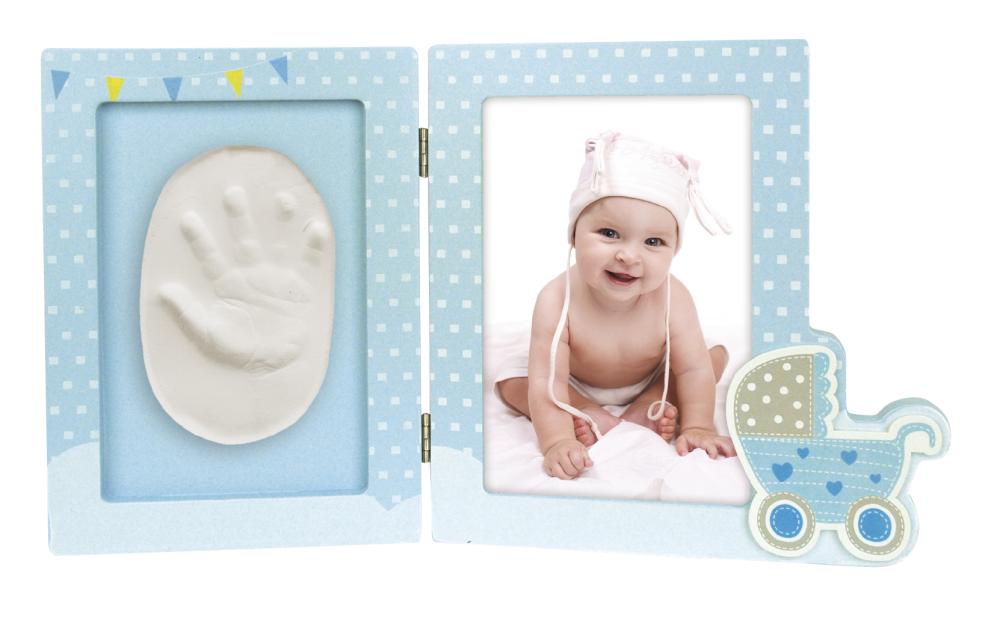Offrez le cadeau le plus mignon pour la baby shower ou le baptême de bébé ! Ce cadre pliant bleu clair a 2 ouvertures pour photo, dont 1 dans laquelle vous pouvez choisir de mettre une petite empreinte de main ou de pied. Ce cadre est de motifs clairs, a des fanions bleus et jaunes dans l'un des coins supérieurs et un landau en relief dans l'un des coins inférieurs. Livré avec un kit de plâtre pour faire l'empreinte de main ou de pied.