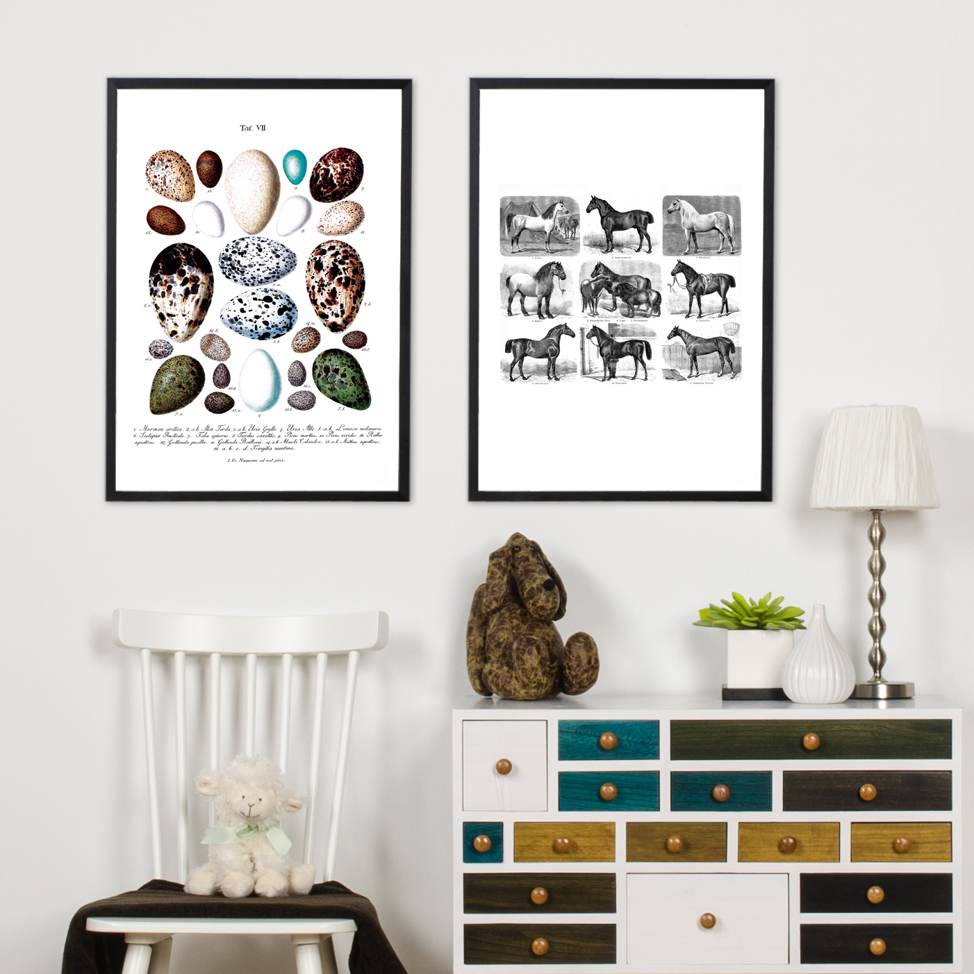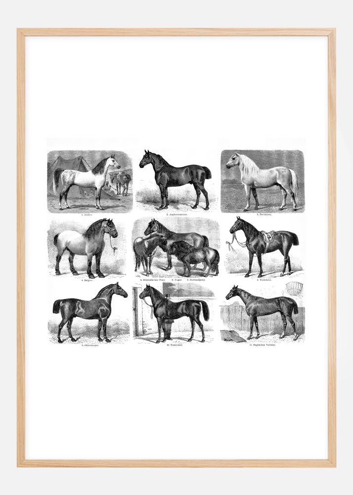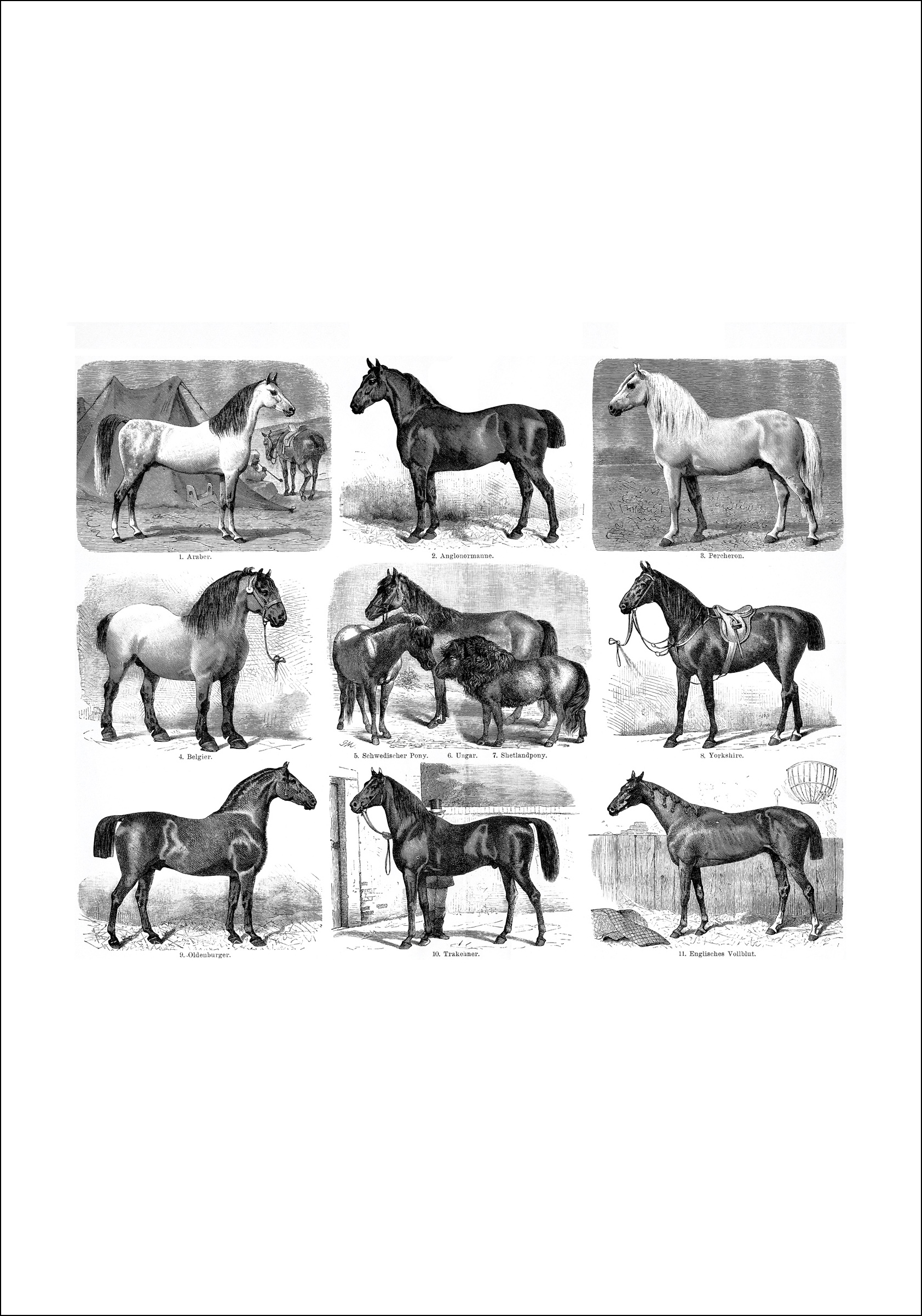 Si vous ne pouvez pas vous lasser des chevaux, nous avons ici une belle affiche avec un motif représentant différentes races de chevaux. Sous chaque image, vous trouverez le nom des races écrit en anglais. Comme l'affiche est en noir et blanc, elle est facile à combiner avec un cadre de couleur élégante. L'affiche est disponible dans plusieurs tailles différentes, adaptées aussi bien à être posée sur une commode qu'à être accrochée au mur.