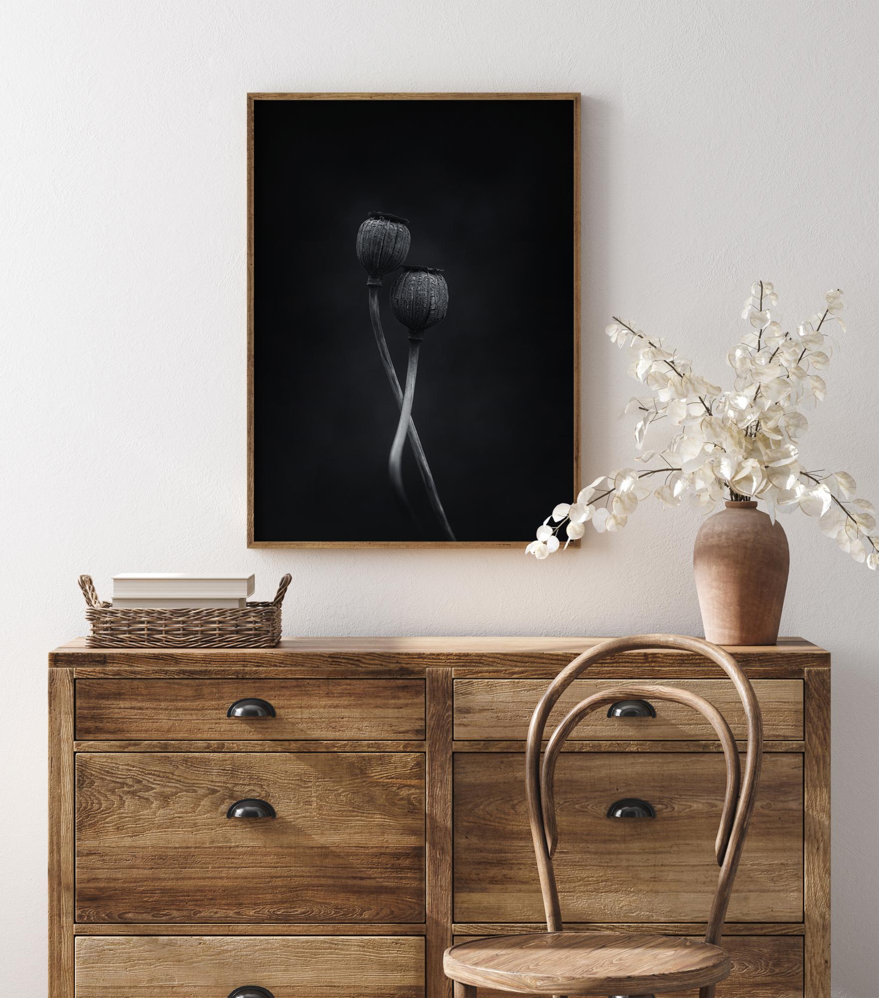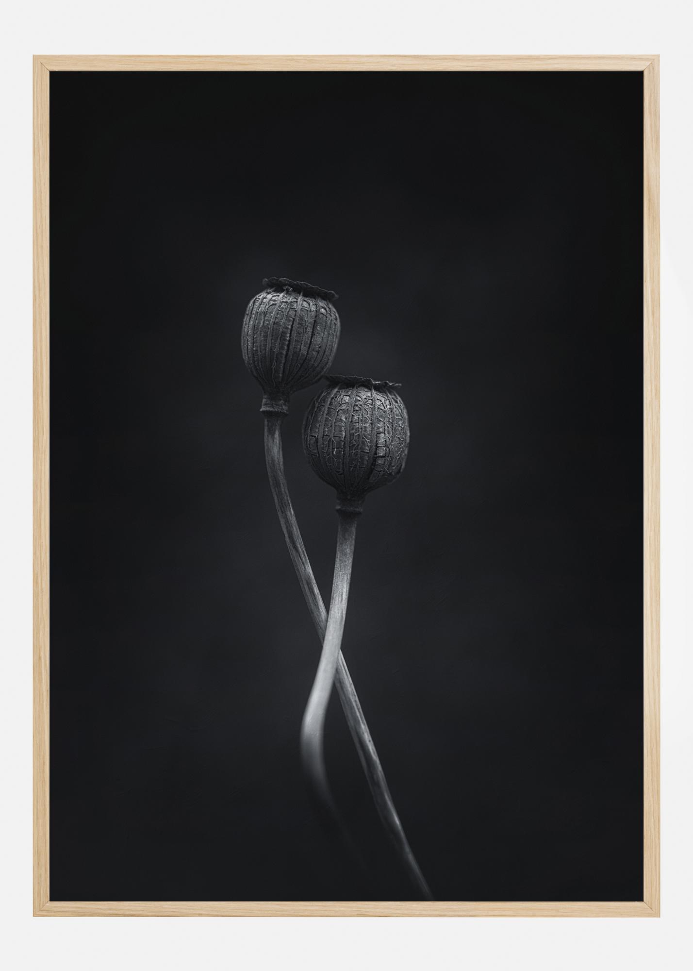 Une affiche nature détaillé de deux têtes de coquelicots entrelacées. Cette photo à l'aspect pictural évoque la sensation de deux danseurs. Ressentez l'amour et l'élégance emplir votre maison lorsque vous installez ce poster chez vous.