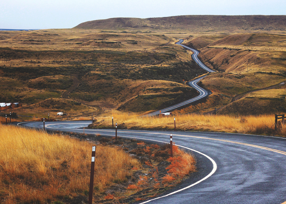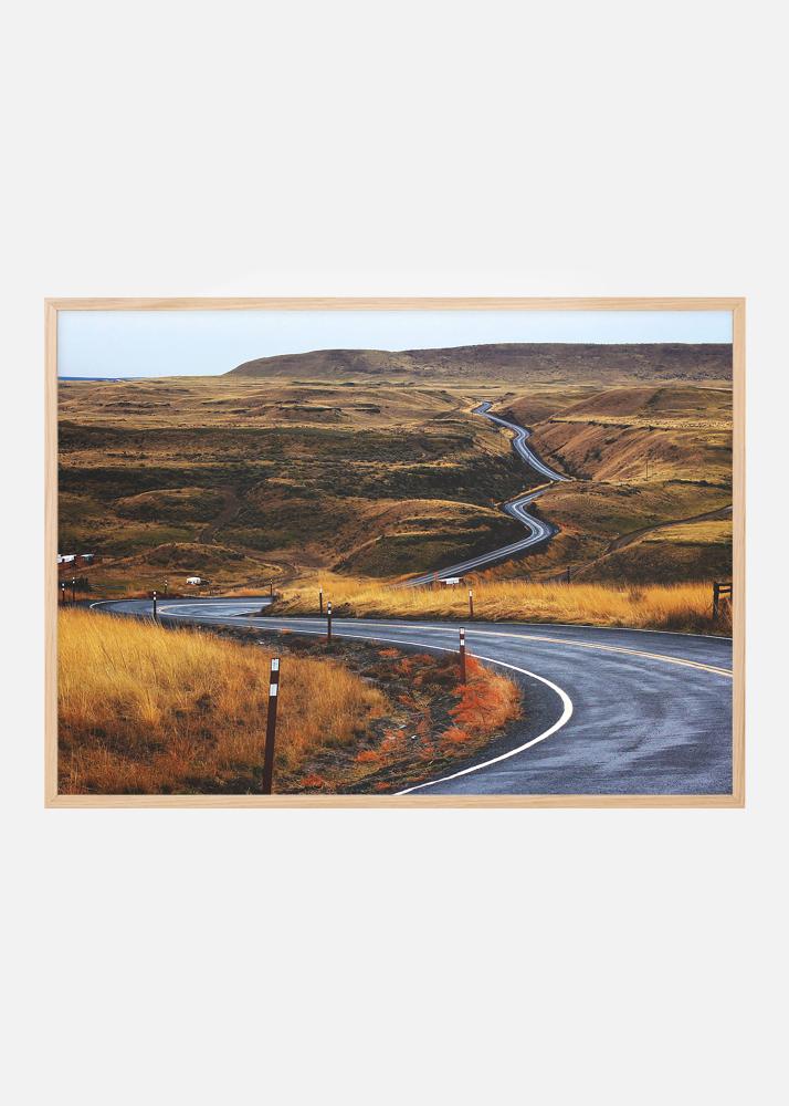 Poster avec une route en asphalte qui serpente à travers un paysage de steppe brûlé par le soleil. Les nuances de jaune-brun de l'herbe contre la surface froide de l'asphalte qui se fraye un chemin à travers le paysage ouvert attirent le regard dans l'image et suivent la route. Le poster convient bien dans un cadre minimaliste où le motif peut être pleinement apprécié et peut être facilement combiné avec d'autres tableaux pour créer un thème.