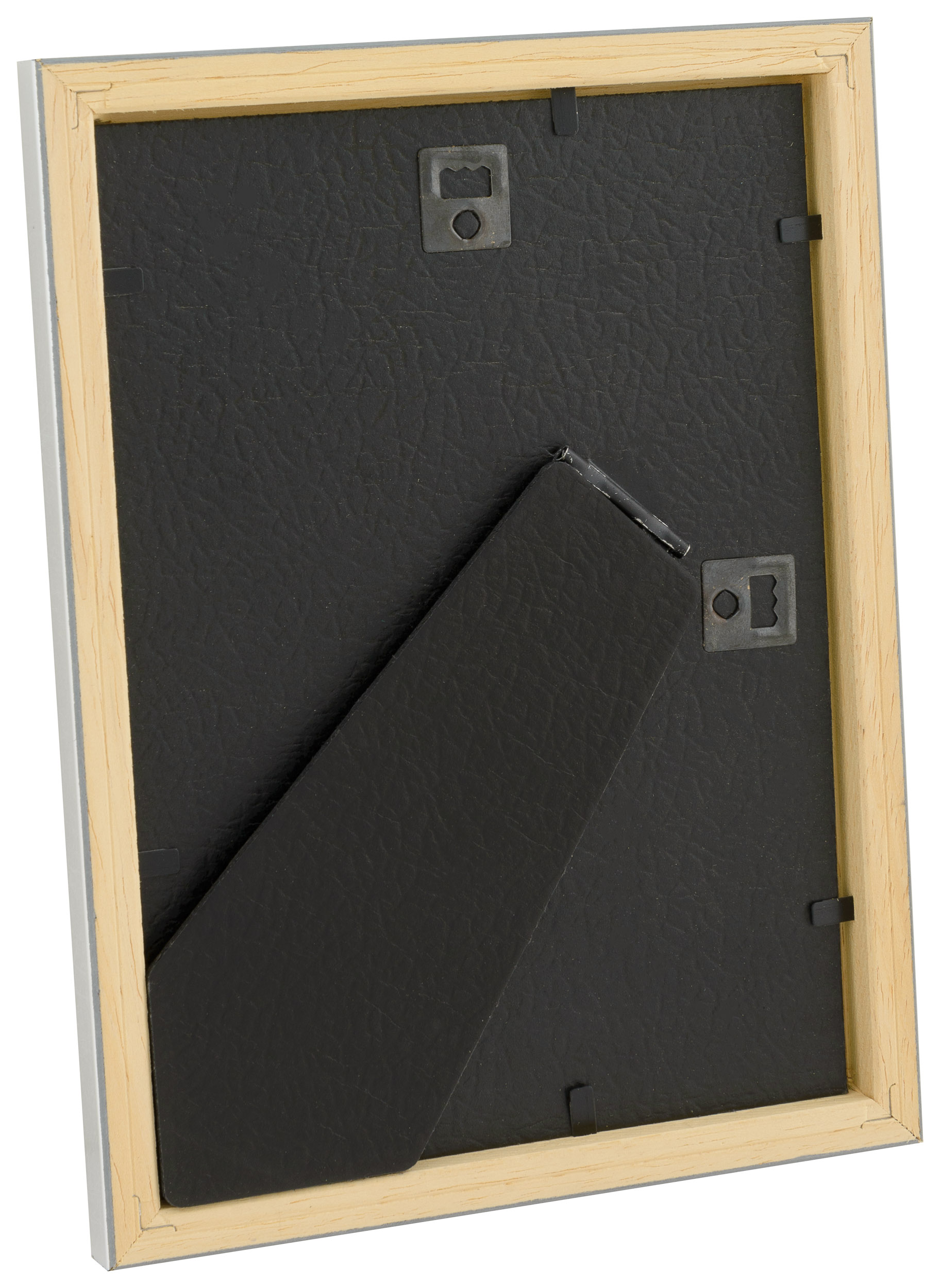 Placez votre photo, votre peinture ou votre poster dans cet élégant cadre ! Ce cadre en bois peint de couleur argentée est doté d'un verre antireflet. Le panneau arrière et le pied sont recouverts de simili cuir noir qui apporte une sensation de luxe supplémentaire.