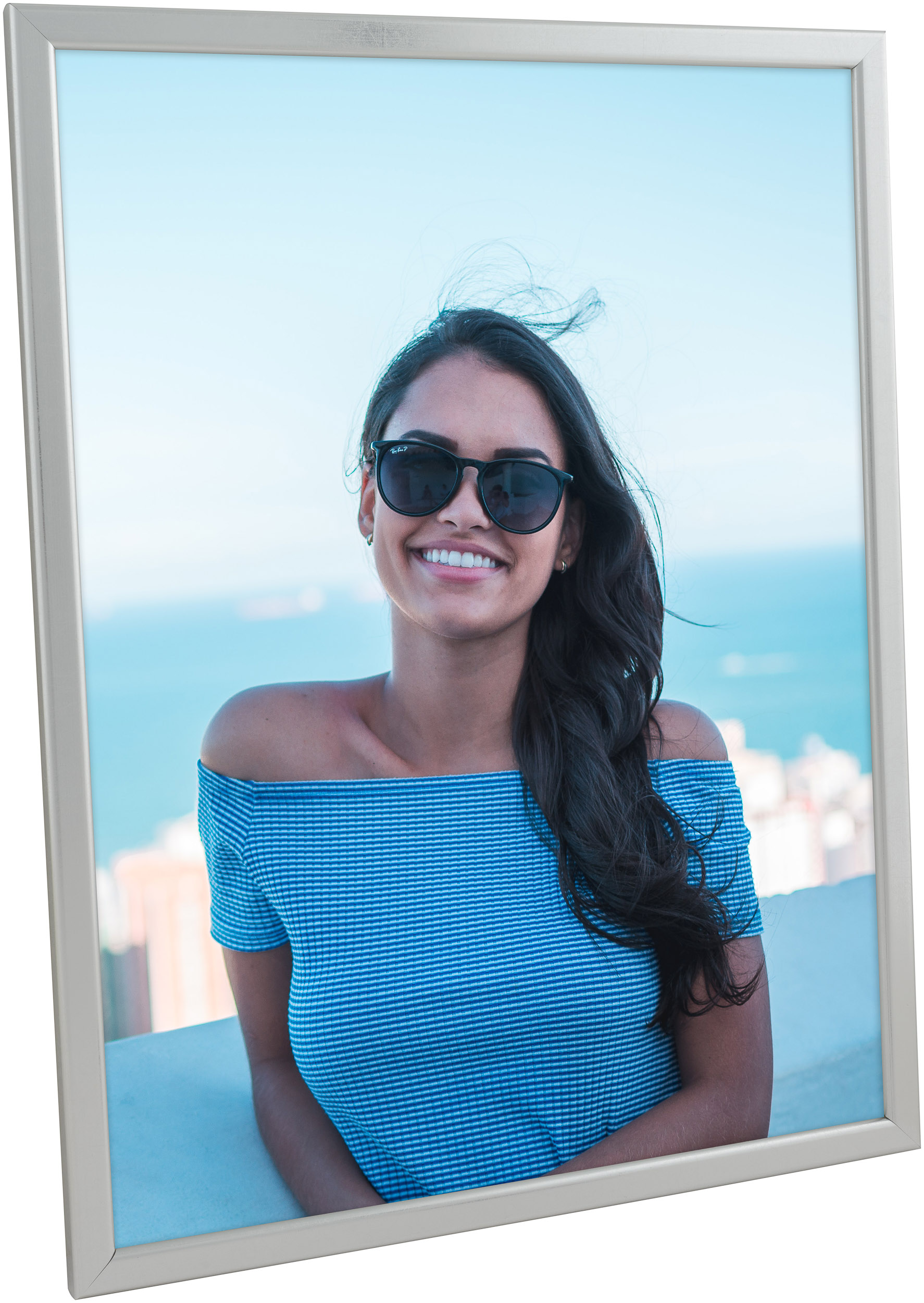 Placez votre photo, votre peinture ou votre poster dans cet élégant cadre ! Ce cadre en bois peint de couleur argentée est doté d'un verre antireflet. Le panneau arrière et le pied sont recouverts de simili cuir noir qui apporte une sensation de luxe supplémentaire.