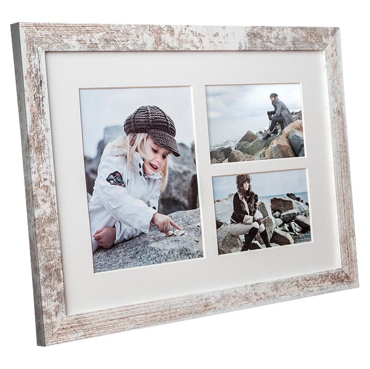 Joli cadre vintage avec un profil de cadre large à l'aspect usé en blanc et bois. Donne une dimension supplémentaire à vos images et convient parfaitement quand vous désirez une sensation vintage authentique. Cadre pêle-mêle avec de la place pour 3 images en format 10x15 cm.