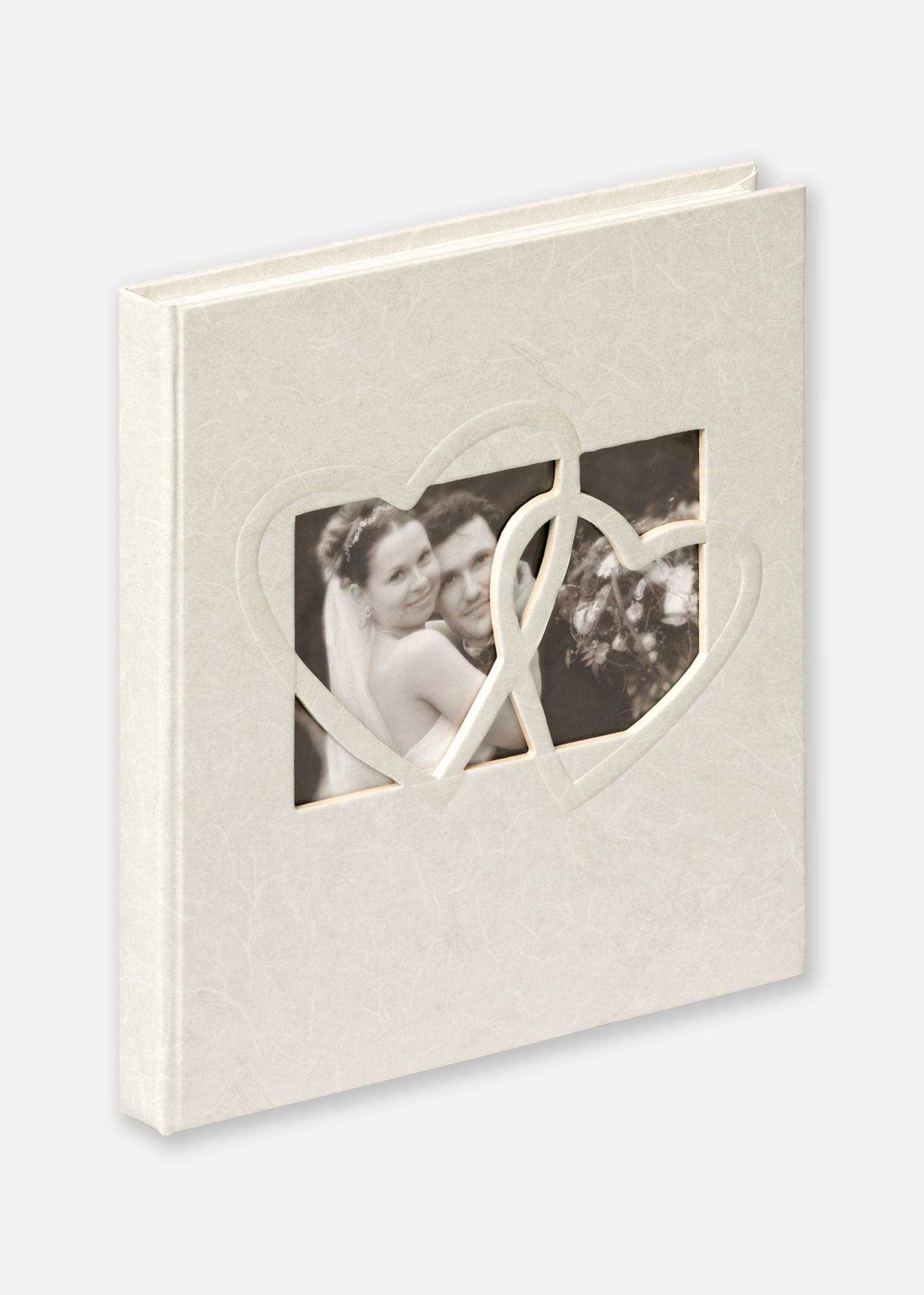 Un romantique livre d'or pour le mariage avec une belle couverture en lin pourvue de motifs en forme de cœur en relief. Il y a aussi un espace pour votre propre image sur le devant.
