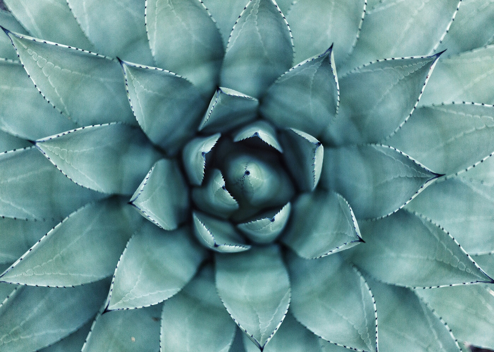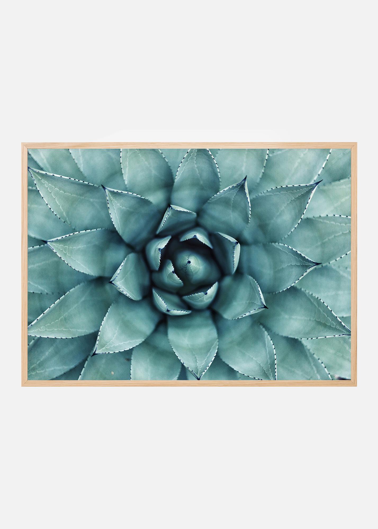 Poster graphique représentant un magnifique plan rapproché d'un cactus vert-bleu. La forme distincte des feuilles avec les épines sombres et la couleur turquoise atténuée créent un motif attrayant qui s'intègre bien dans tous types de décorations. Avec un cadre sombre, la photographie se distingue bien sur le mur seule, mais elle peut également être utilisée comme partie d'un collage de photos avec des plantes.