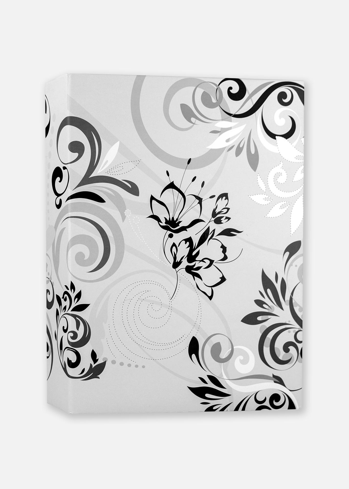 L'album a une couverture robuste avec un motif floral élégant en noir et gris. C'est un album photo décoratif qui a fière allure à la fois sur l'étagère et présenté de face.