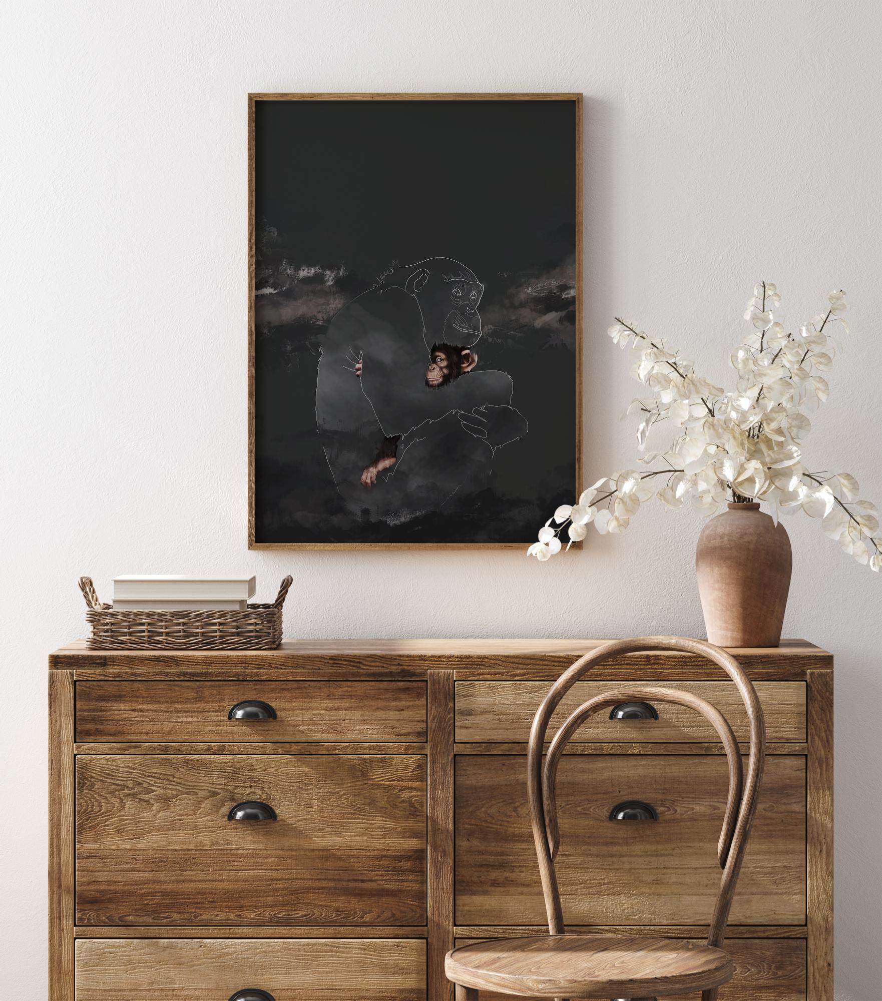 Un poster émouvant d'un bébé chimpanzé serrant dans ses bras l'image stylisée de sa mère. Wish You Were Here est une image émouvante où le bébé chimpanzé n'étreint rien d'autre que le contour de sa mère assise dans le ciel noir sur des nuages doux.