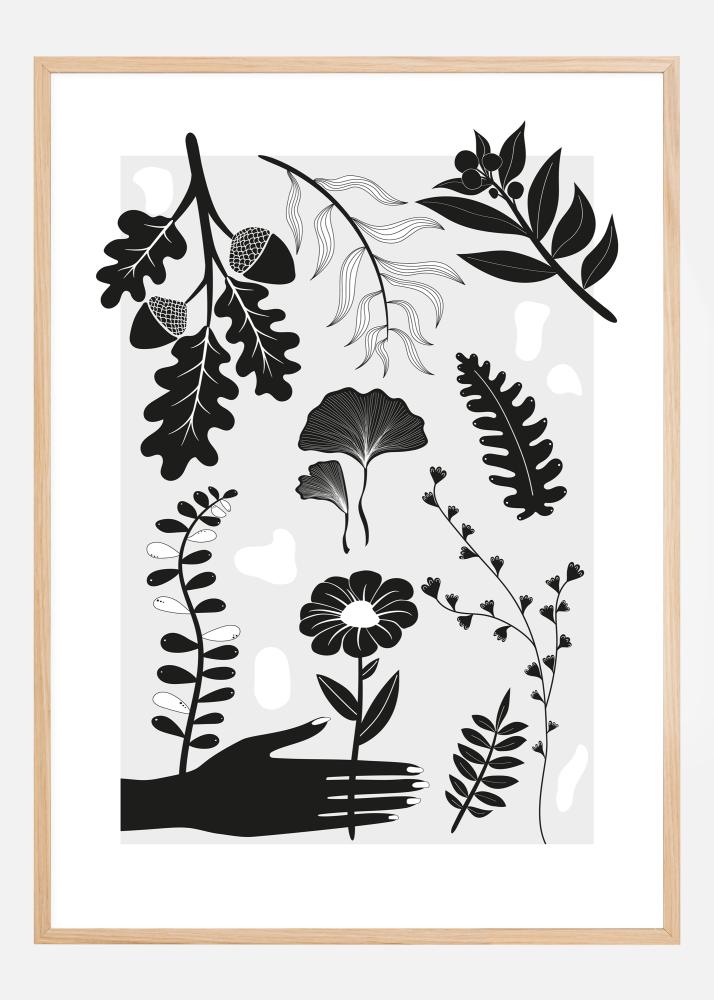 Une affiche audacieuse avec des motifs imprimés en noir et blanc de différentes feuilles, plantes et fleurs. Une main noire se tend pour saisir l'une des fleurs stylisées. Des glands, des fleurs, des fougères et autres remplissent cette impression simple mais intéressante. Ajoutez une touche botanique à votre intérieur avec ce poster de plantes.