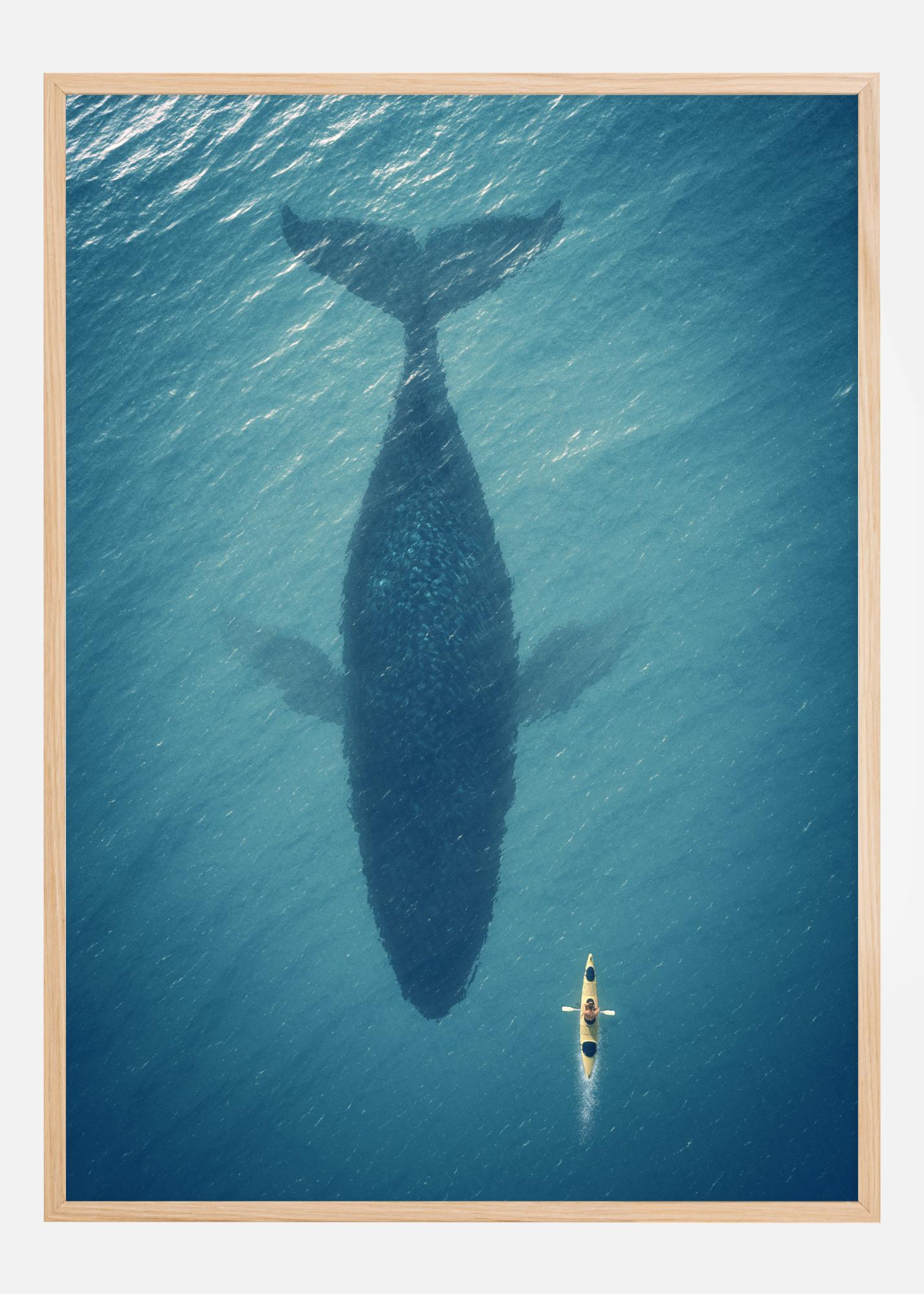 Cette affiche fascinante capture un instantané d'un kayakiste et la silhouette majestueuse de la baleine qui apparaît juste sous la surface de la mer scintillante. Le contraste entre le petit embarcation et l'énorme baleine donne une forte impression de la grandeur de la nature, tandis que la palette de couleurs bleue transmet une sensation de calme et de profondeur inconnue de la mer.