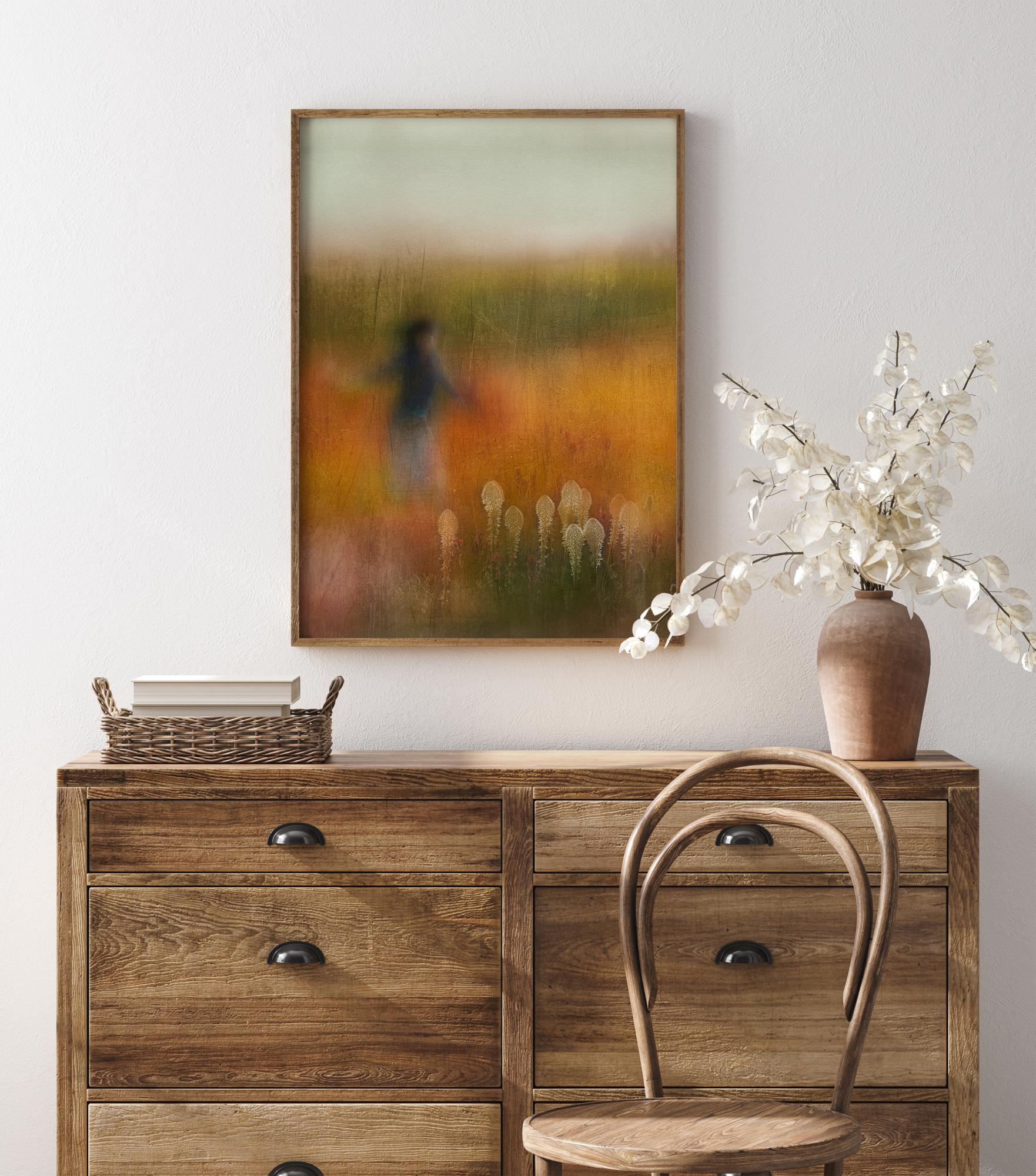 Une affiche abstraite d'une fille dans les herbes hautes. L'image est un doux travail de peinture avec des jaunes et des verts évoquant le printemps. La jeune fille se déplace à travers les coups de pinceau puissants de l'herbe pour créer du mouvement dans toute l'image. Ajoutez ce tableau à votre intérieur pour surprendre vos amis.
