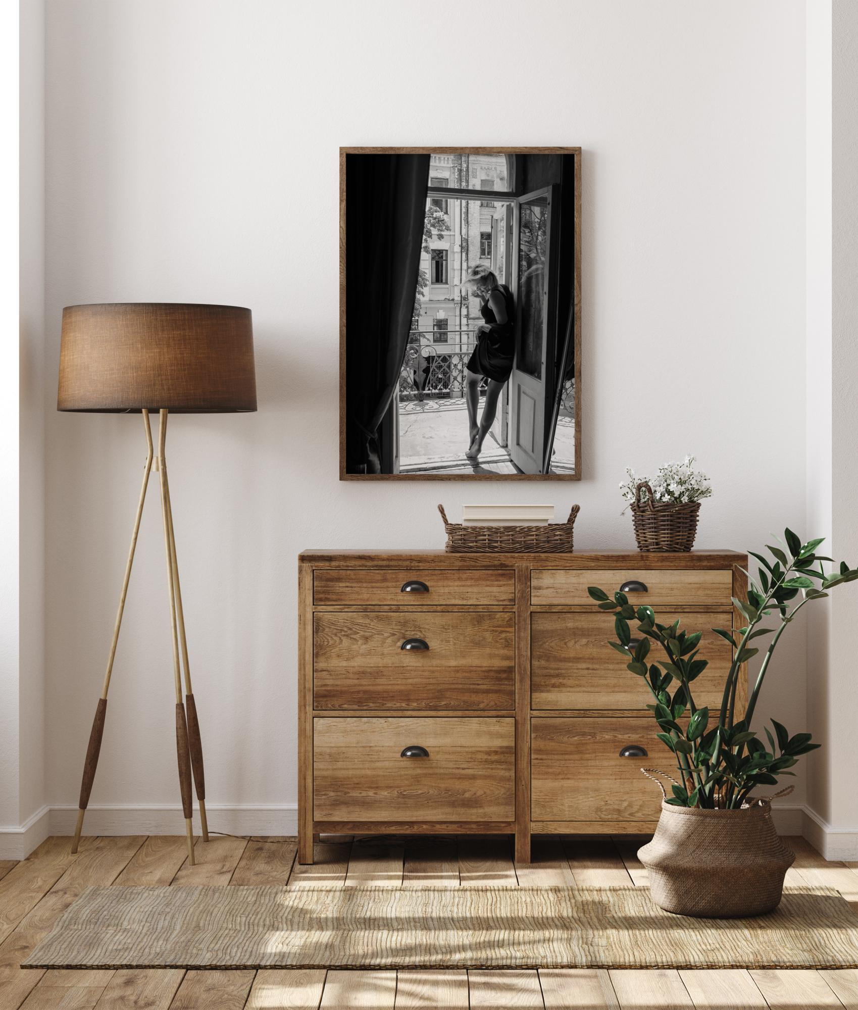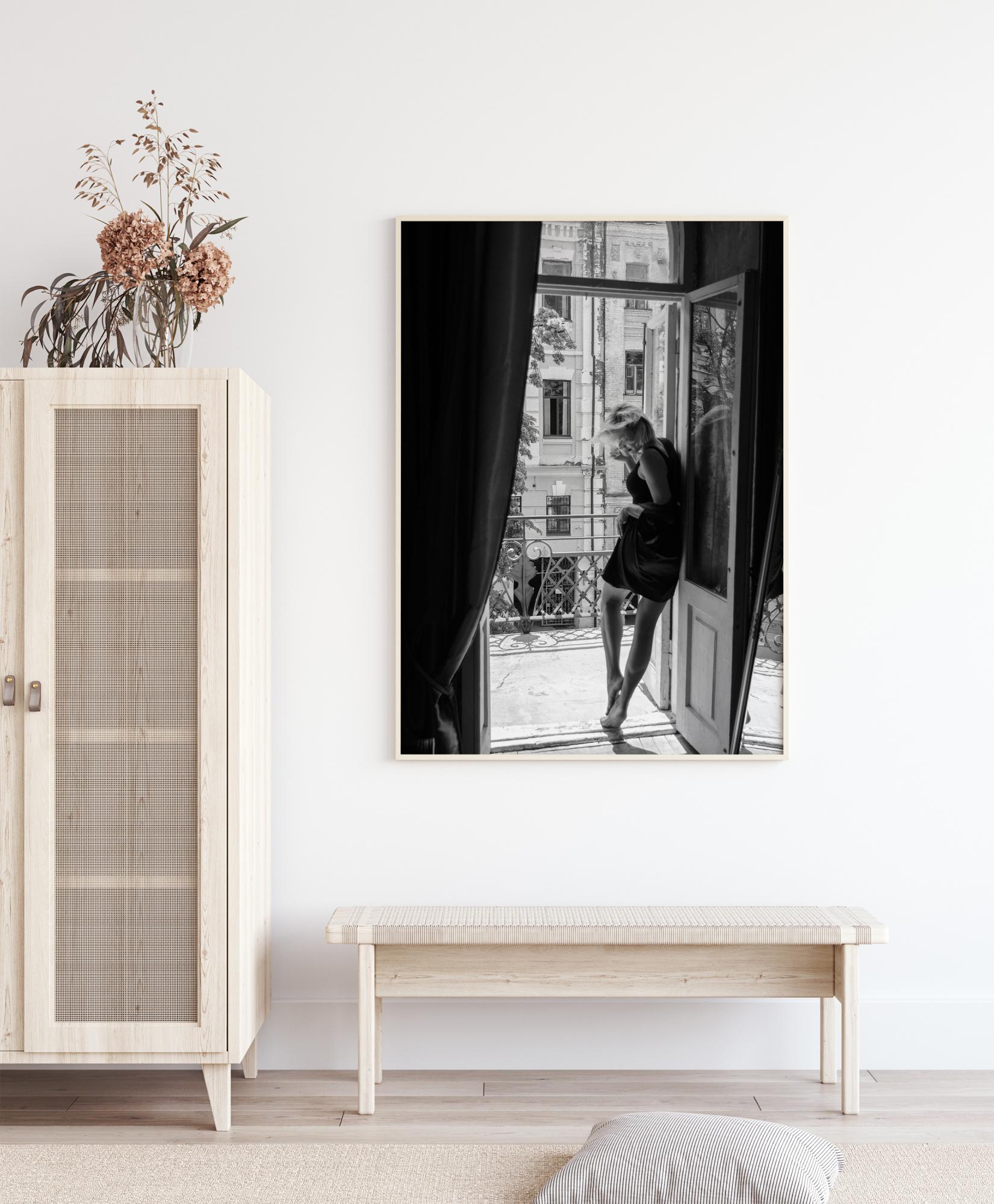 Une affiche classique d'une femme sur un balcon à Paris. Elle est appuyée à une porte et hissée sur la pointe des pieds avec sa robe noire qui lui allonge ses jambes nues. Ce poster en noir et blanc ira très bien avec un mur de couleur vive. Élégance assurée.