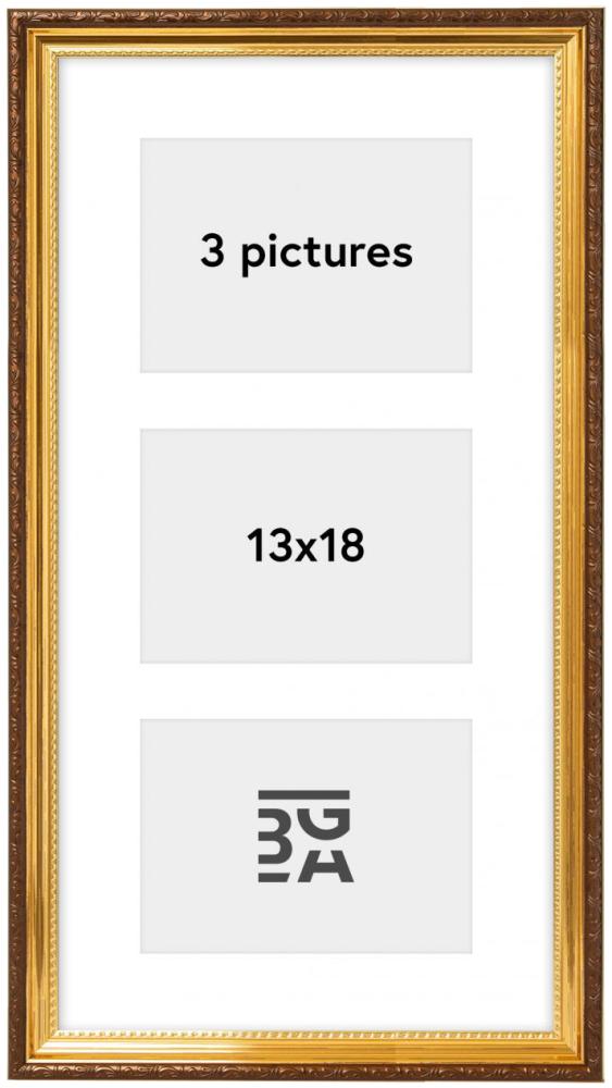 Grâce à ce cadre pêle-mêle vous avez la possibilité de décorer votre mur avec images de la famille, des amis ainsi que des photos souvenirs de superbes moments vécus. Le cadre contient assez de place pour 3 images de taille 13x18 cm. Ce cadre de couleur dorée est dans un joli style rétro et sa bordure externe décorative se présente dans une nuance brune chaude. Supports muraux inclus.