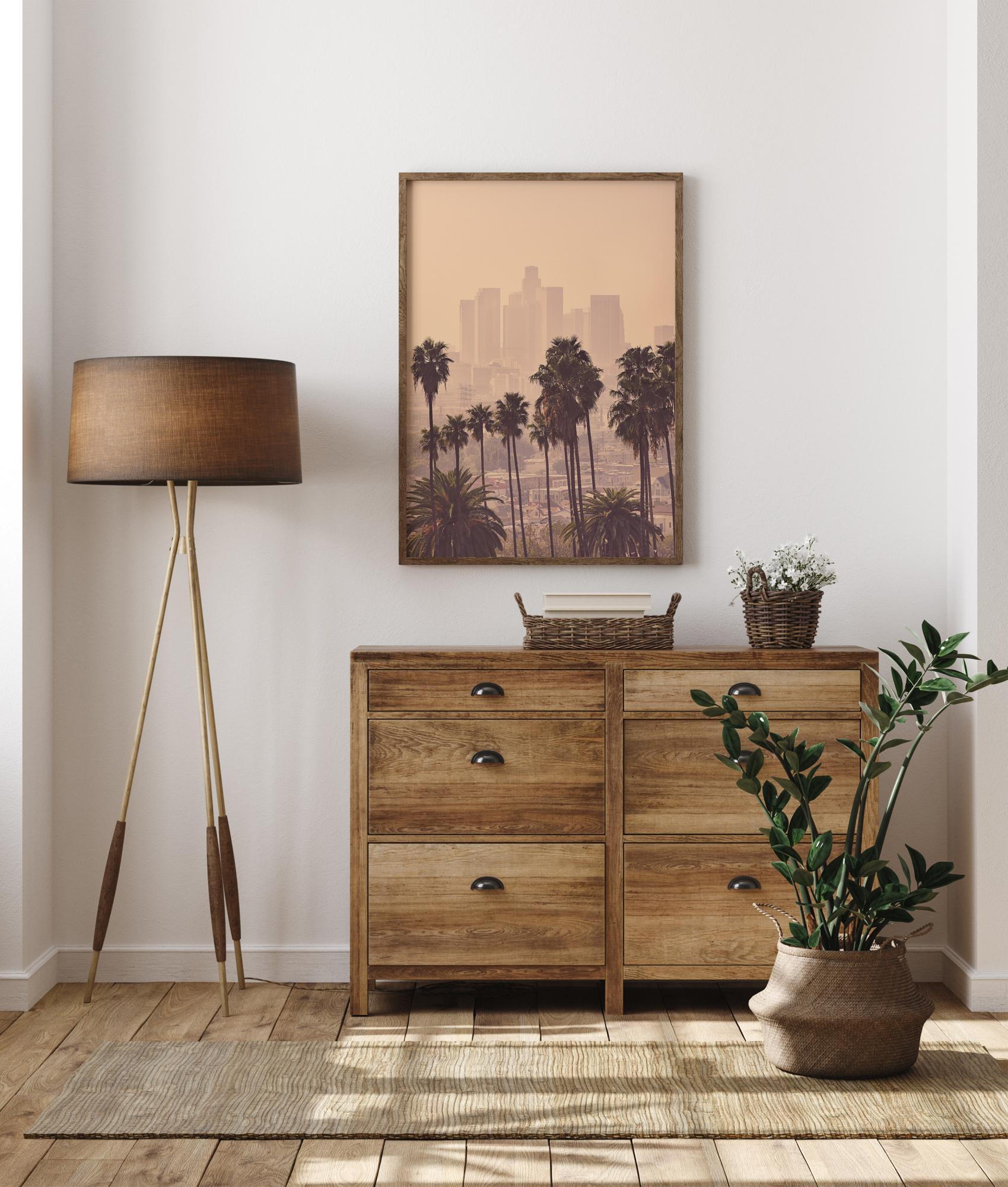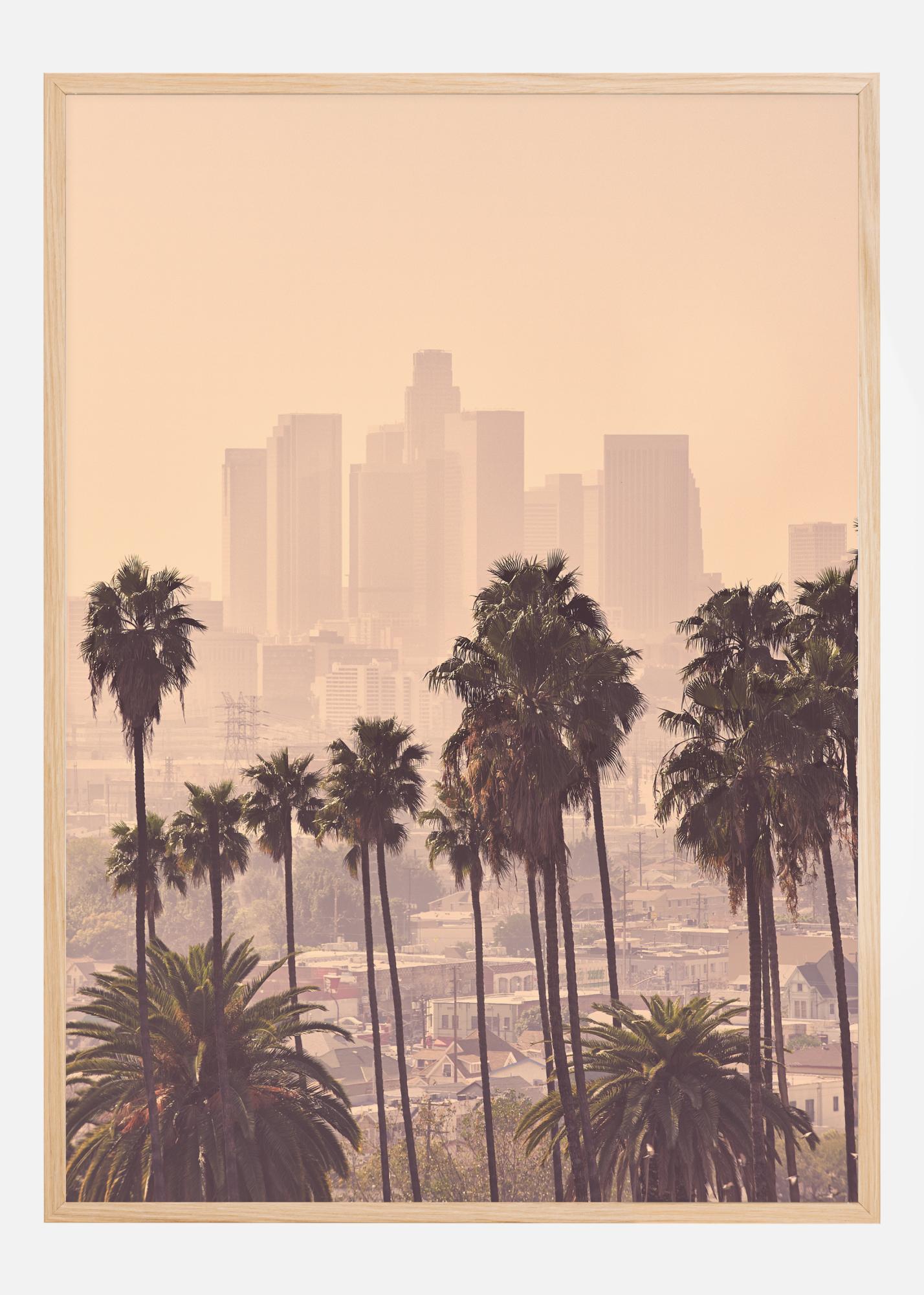 Une affiche de paysage urbain avec des palmiers à queue de renard au premier plan et la silhouette d'une ville à l'arrière-plan. Les palmiers sont bien mis en évidence, tandis que les gratte-ciel brumeux à l'arrière-plan mettent l'accent sur la nature. Vous pouvez ressentir l'aura de la vie urbaine dans cette impression sépia.