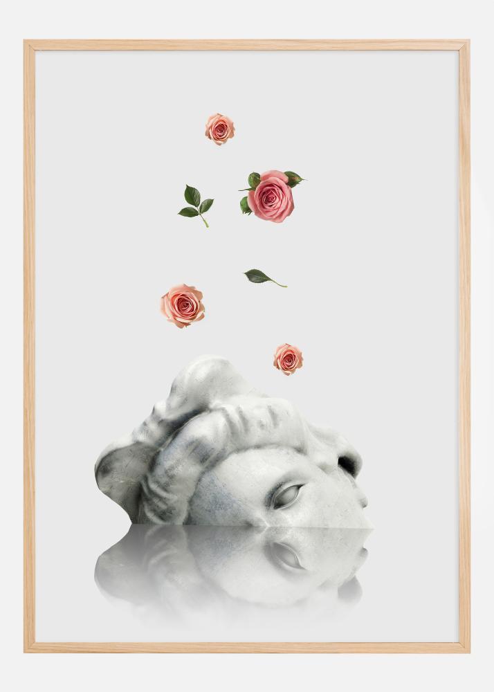 Ce poster artistique présente une composition onirique où une sculpture d'un visage, qui semble s'enfoncer ou se dissoudre, est entourée de roses tourbillonnantes à différents stades de floraison et de feuillage. C'est une image captivante qui réunit la beauté de la pierre et de la flore, offrant une sensation à la fois d'intemporalité et de fugacité.