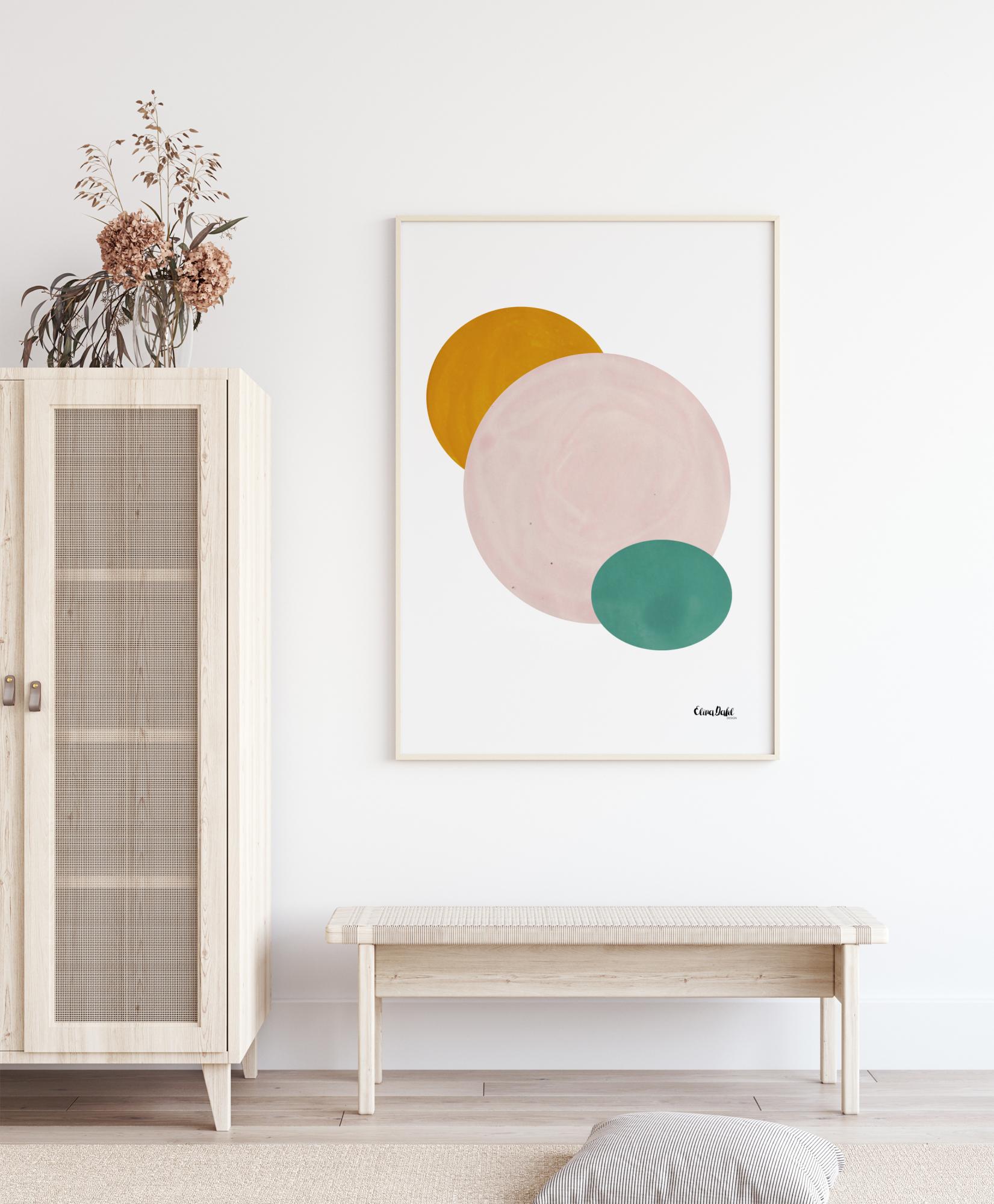 Une poster abstraite merveilleusement simple avec des formes graphiques aux couleurs pastel, créée par la designer Elina Dahl. Un tableau épuré qui convient parfaitement, par exemple, dans une maison minimaliste, moderne ou inspirée du rétro. Ce poster s'associe à merveille avec les autres posters d'Elina Dahl dans le même style.