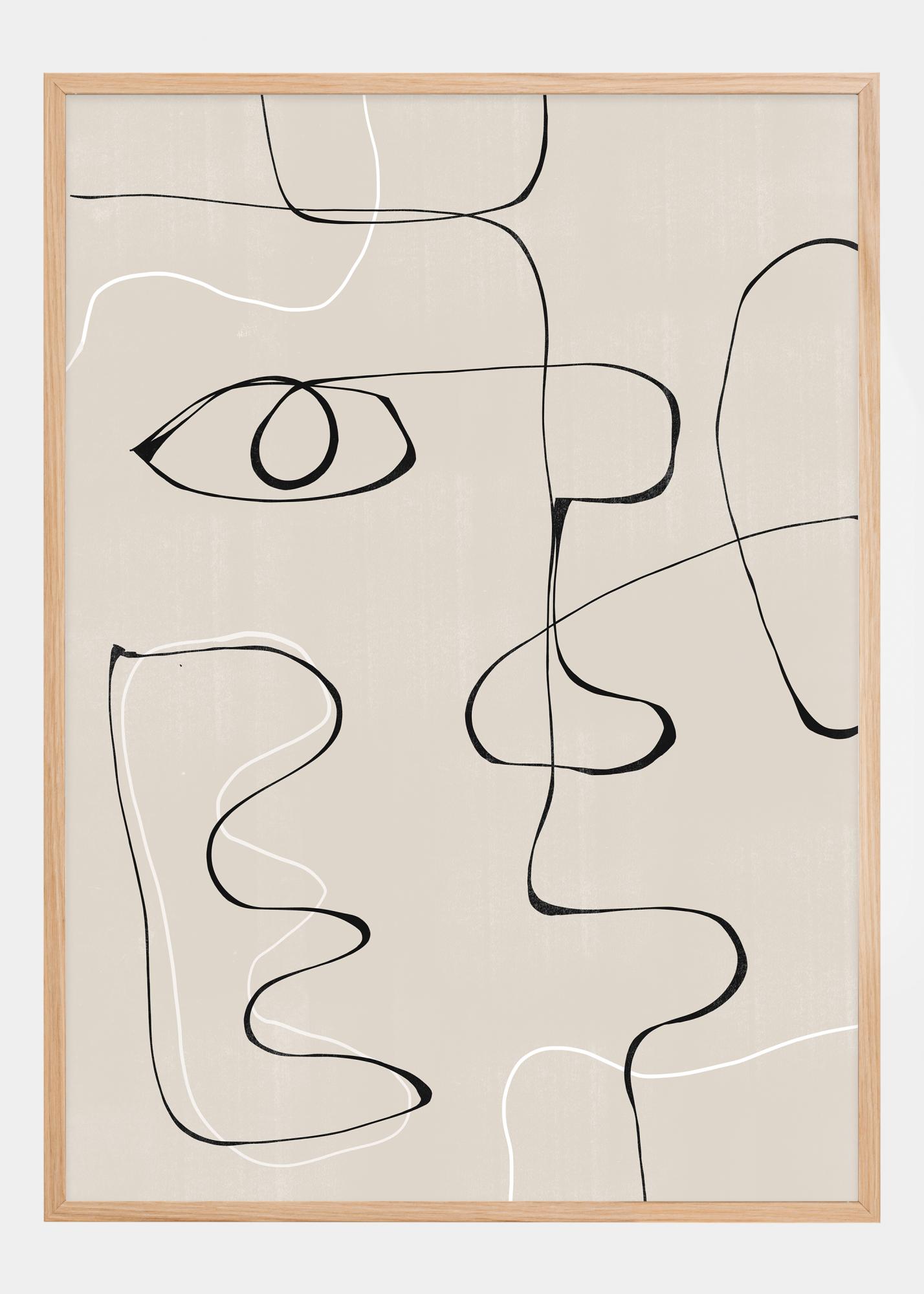 Ce poster dégage une élégance minimaliste avec son jeu de lignes abstraites qui suggère un contour de visage. L'œil solitaire au centre donne une impression profonde et pénétrante, entouré de courbes ondulantes qui peuvent représenter d'autres traits du visage. Le concept abstrait est parfait pour ceux qui apprécient l'art qui raconte une histoire sans dévoiler explicitement chaque détail.