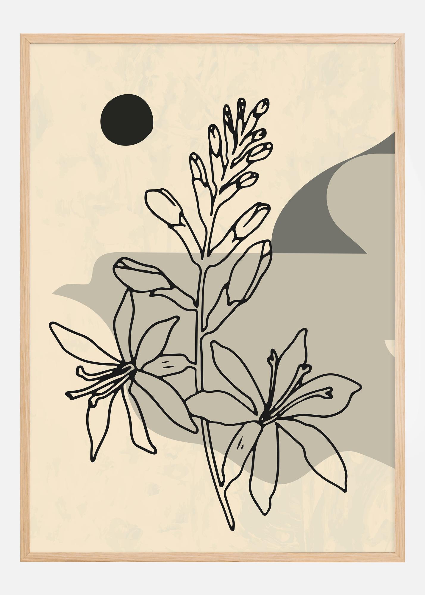 Cette affiche esthétiquement attrayante capture une interprétation abstraite de fleurs en fleurs, où des lignes graphiques rencontrent des formes organiques. L'œuvre se joue sur un fond neutre en beige, complété par une forme circulaire sombre qui apporte contraste et profondeur. Au premier plan, des fleurs et des bourgeons stylisés s'élèvent en silhouette, créés avec des contours noirs nets qui produisent un effet visuel puissant.
