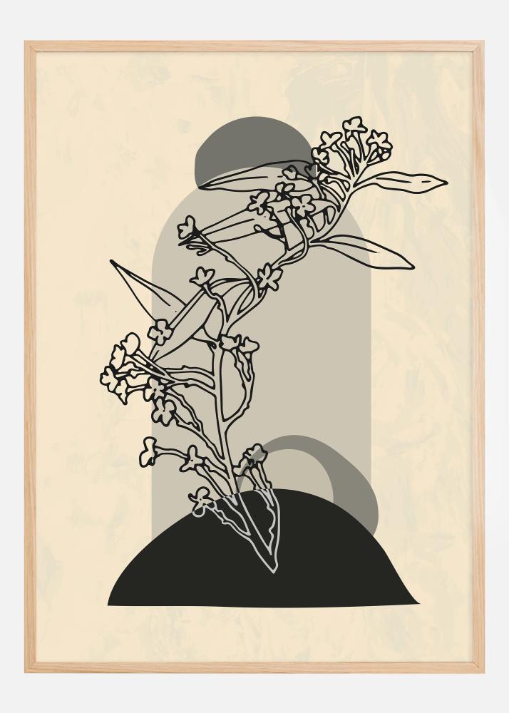 Cette affiche sophistiquée représente une inflorescence abstraite qui combine des formes naturelles avec des éléments graphiques pour une sensation contemporaine. Le motif utilise une palette de couleurs subtiles avec des tons beiges doux et des lignes noires audacieuses, créant un contraste à la fois saisissant et élégant. Le design accorde une grande importance à la composition et à l'équilibre, en plaçant les formes organiques des fleurs et des feuilles sur un demi-cercle noir solide, créant une illusion d'ombre et de profondeur.