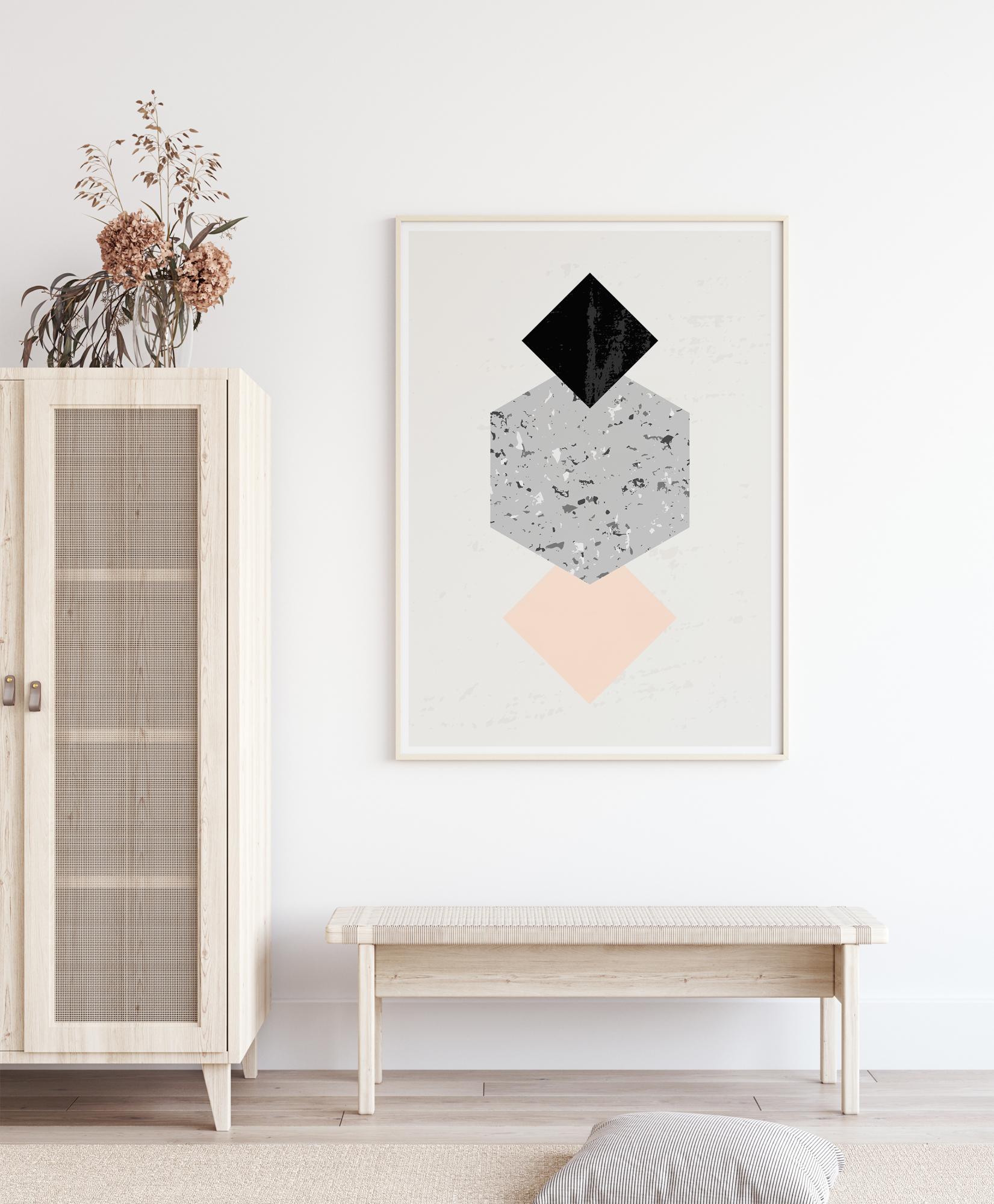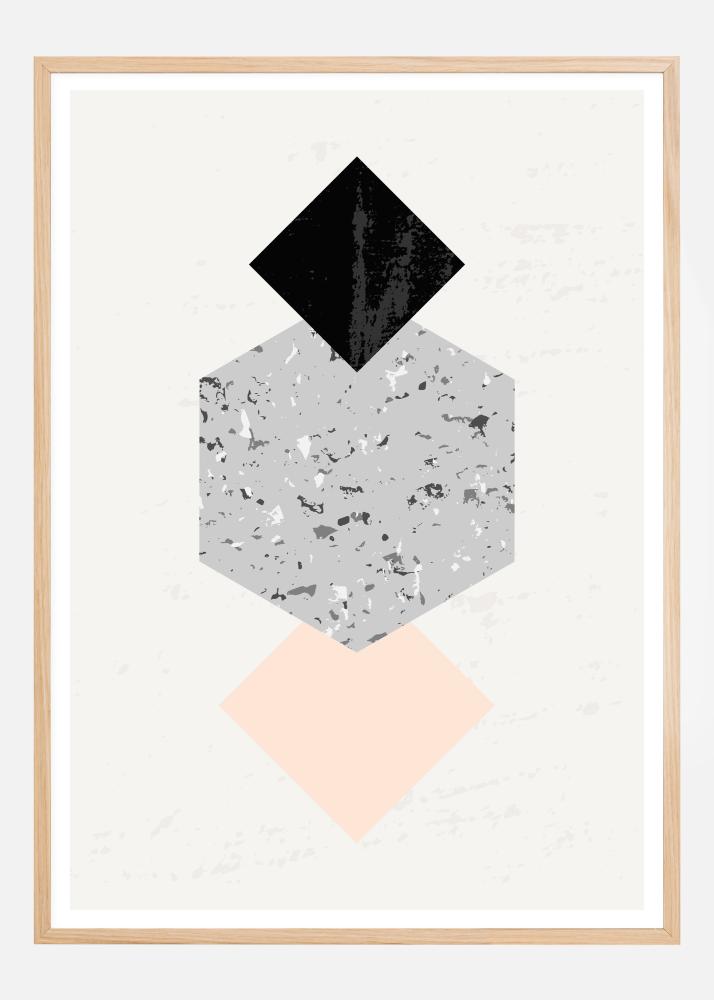 Une affiche géométrique forte, pleine de formes abstraites, qui s'intègrent toutes dans un design cohérent. Deux grands triangles noirs s'alignent ensemble comme un sablier. Autour d'eux se trouve un diamant rose et deux hexagones bleus en forme de galets, chacun s'intégrant parfaitement dans cette image forte et intéressante. Accrochez-la dans un hall pour faire passer le message.