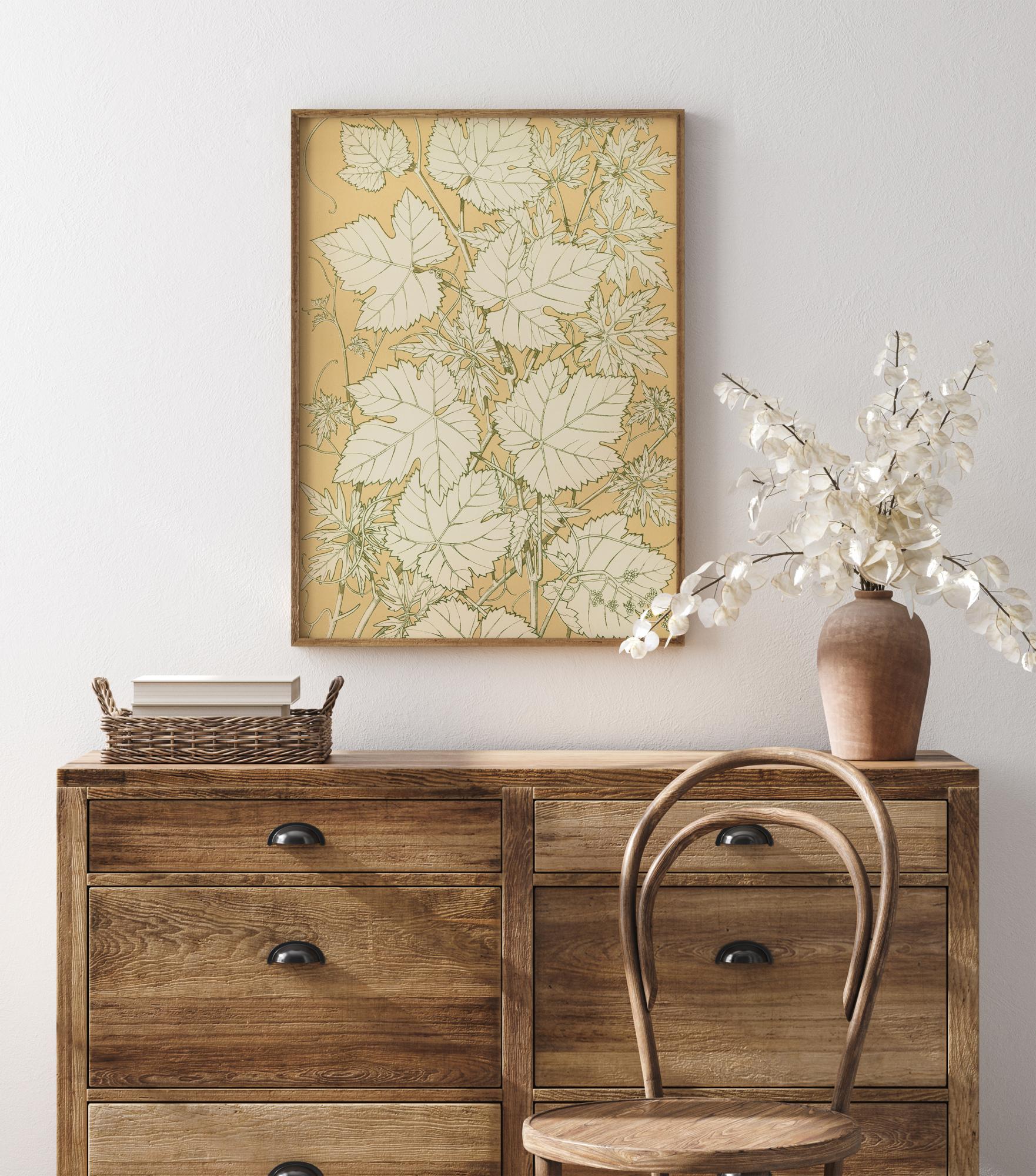 Une affiche nature avec des feuilles sur un fond orange pastel. Les feuilles sont dessinées à l'encre noire et sans couleur, ce qui les fait ressortir comme un motif imprimé sur le fond uni. Égayez un mur uni de votre maison avec cet imprimé simple et faites entrer la nature chez vous.