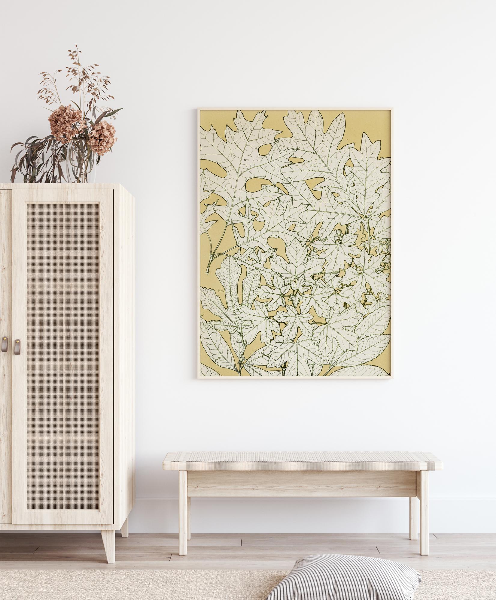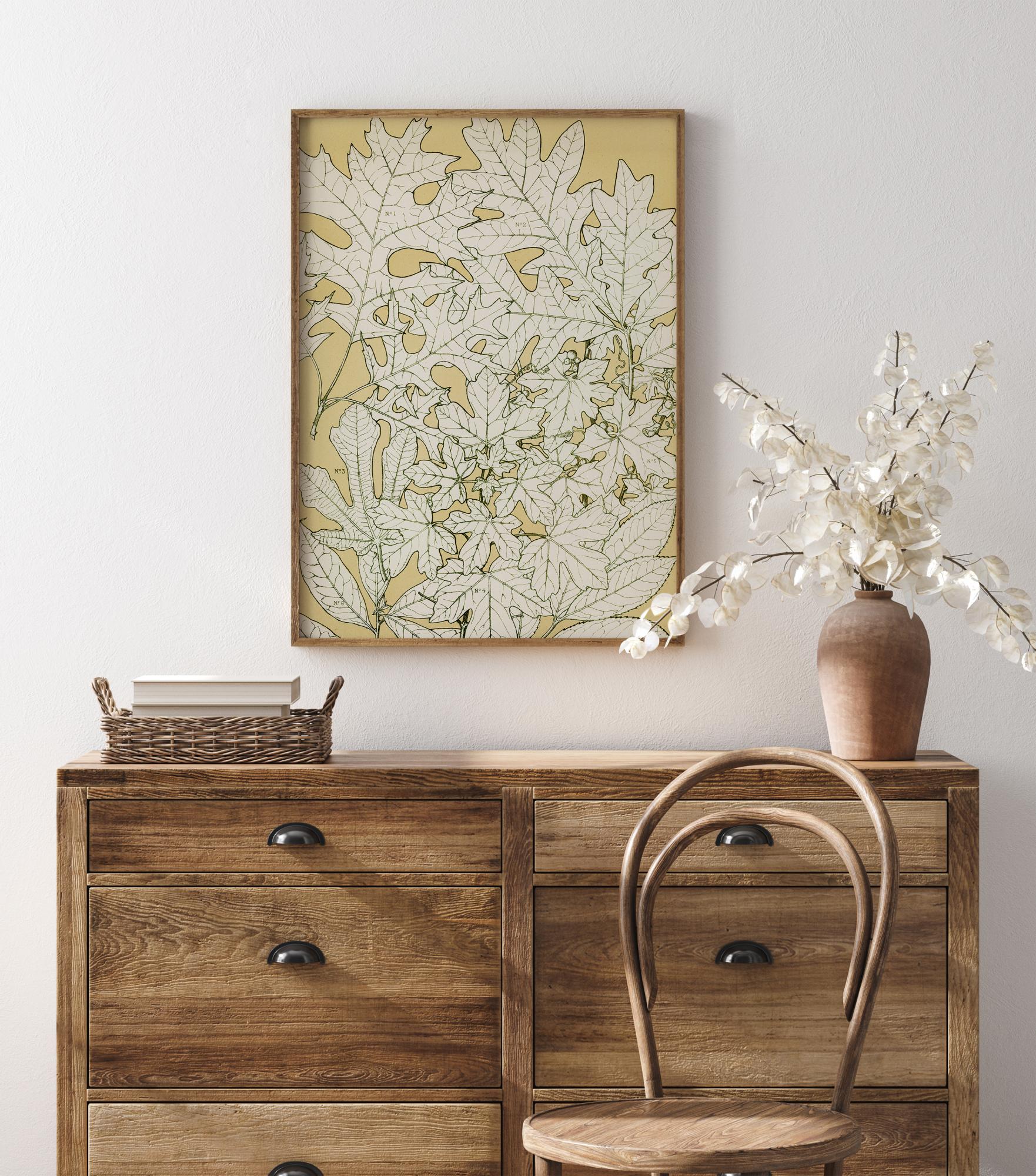 Une affiche abstraite avec de simples feuilles dessinées sur un fond or pâle. Quelques-unes sont soigneusement dessinées, avec leurs nervures et leurs tiges. L'absence de couleur les fait ressortir sur le fond uni qui réveèle leurs détails. Ajoutez ce poster à un mur simple pour créer une ambiance naturelle dans votre maison.
