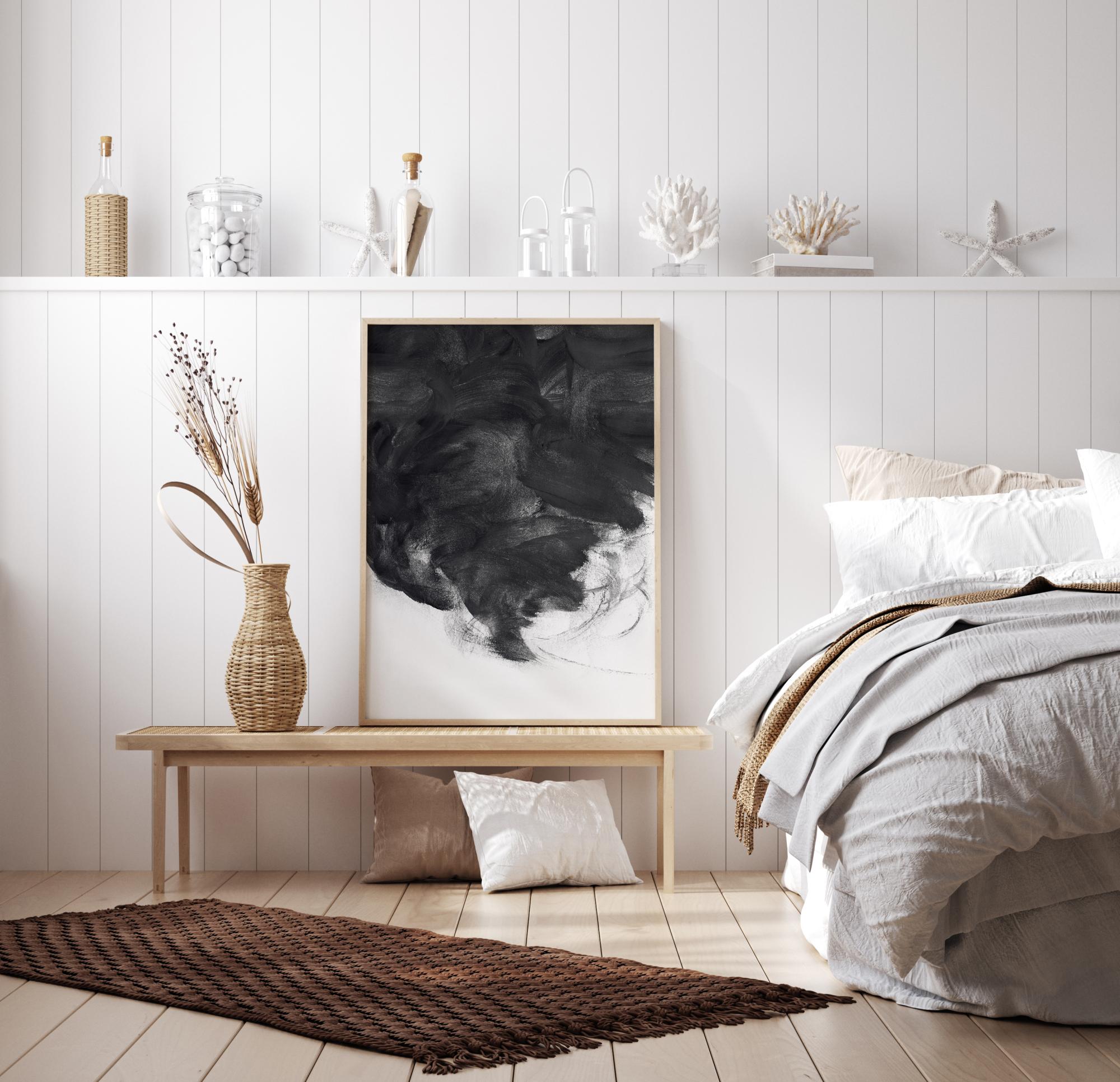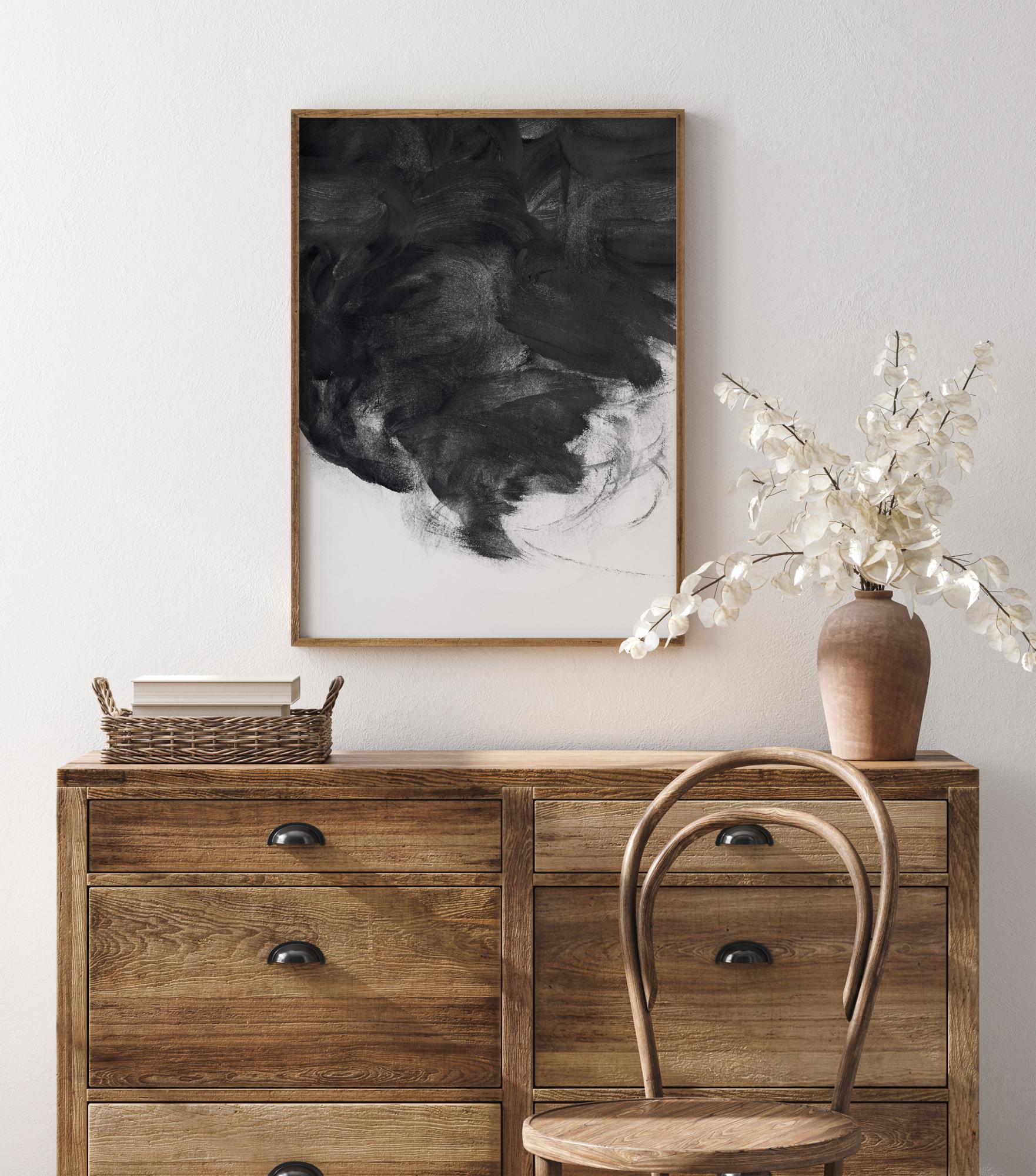 Une affiche abstraite d'un tourbillon noir. Cette pièce étonnante, en noir et blanc, conduit le regard du haut vers le centre en passant par le tourbillon noir. Lorsque le noir rencontre le blanc, imaginez une grotte, une tempête, un orage ou des nuages dans cette affiche pleine de mouvement. Placez-la sur un mur clair pour obtenir un effet spectaculaire et épique.