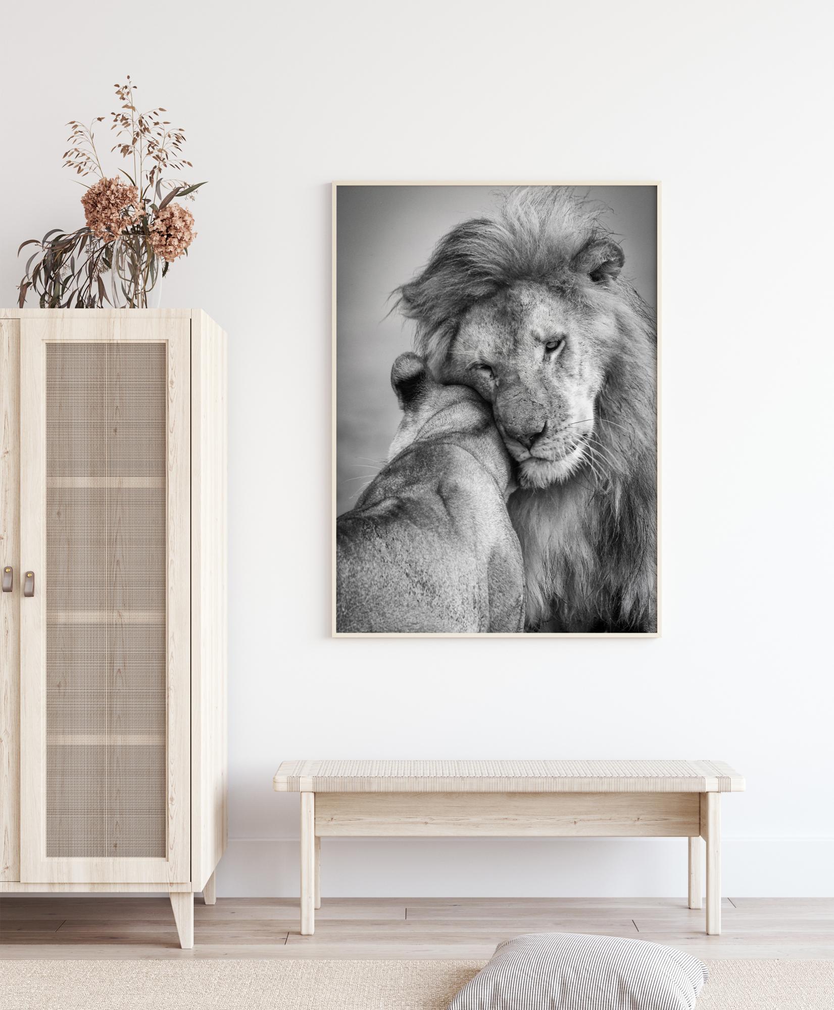 Une affiche nature représentant un lion et une lionne dans un moment de tendresse. Sur cette superbe photo en noir et blanc, le lion câline sa lionne qui se blottit dans son cou, dos au spectateur. Vous sentez l'amour dans cette étreinte chaleureuse ? Imaginez l’avoir sous les yeux quand vous vous levez chaque matin.