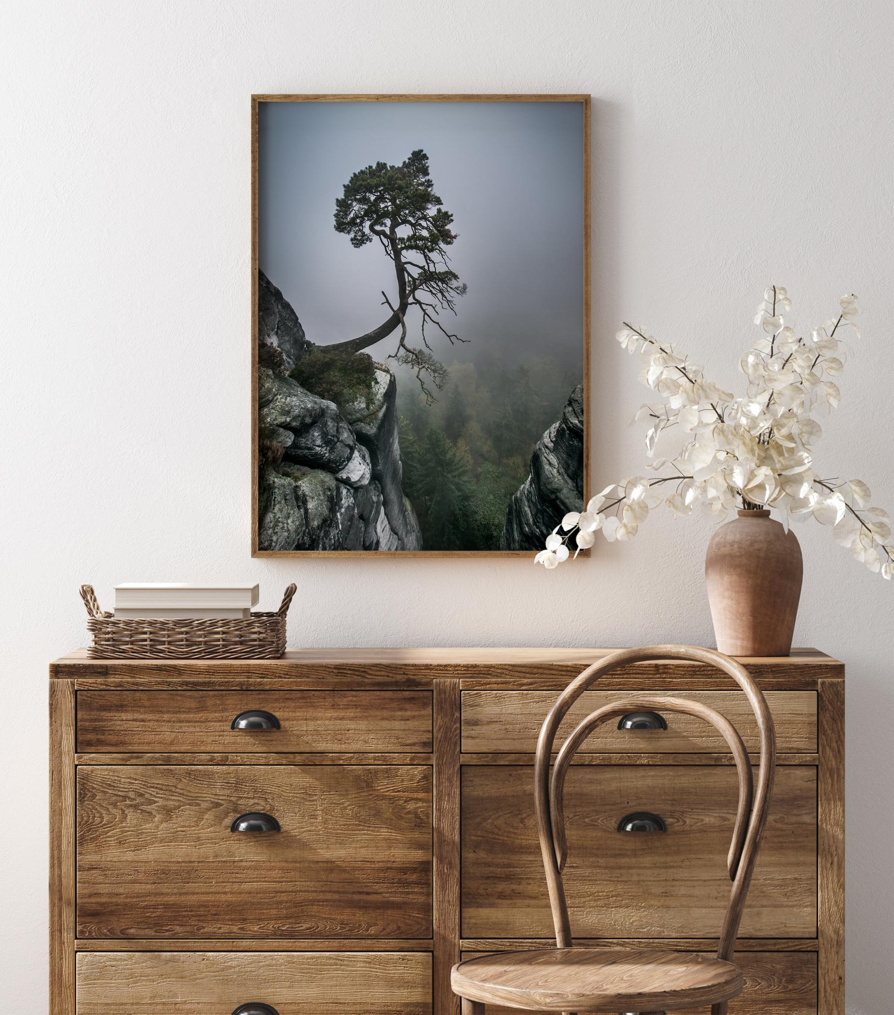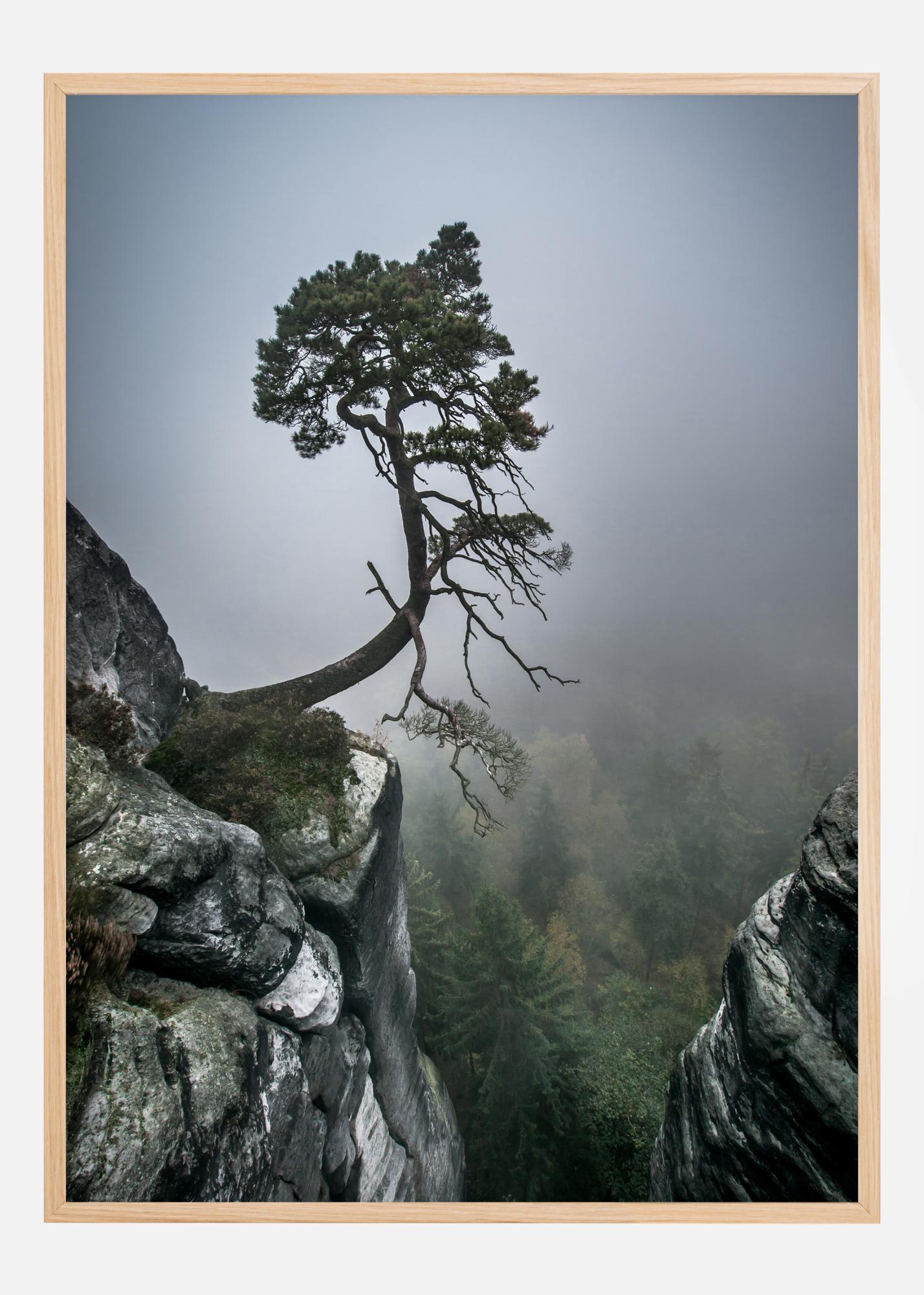 Une affiche de nature fantastique d'un arbre tordu poussant sur le côté d'une falaise. En couleur, l'arbre se penche dans un abîme entre deux parois rocheuses grises et abruptes. Une forêt se dessine en contrebas, enveloppée de brume, la lumière mettant en valeur l'arbre qui s'accroche. Accrochez cette merveille de la nature chez vous.