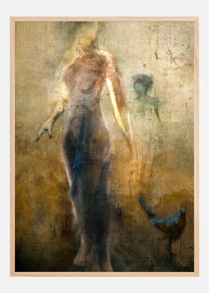 Attirez l'attention avec cette affiche mystérieuse et suggestive qui semble raconter une histoire au-delà du visuel. Le motif explore les thèmes de l'identité et de la mémoire à travers une figure qui émerge d'un fond inspiré du grunge. L'élément abstrait de l'œuvre d'art apparaît à travers l'apparition diffuse, presque fantomatique, de la figure et les subtiles suggestions d'une silhouette en arrière-plan, tandis qu'un oiseau solitaire semble planer librement.