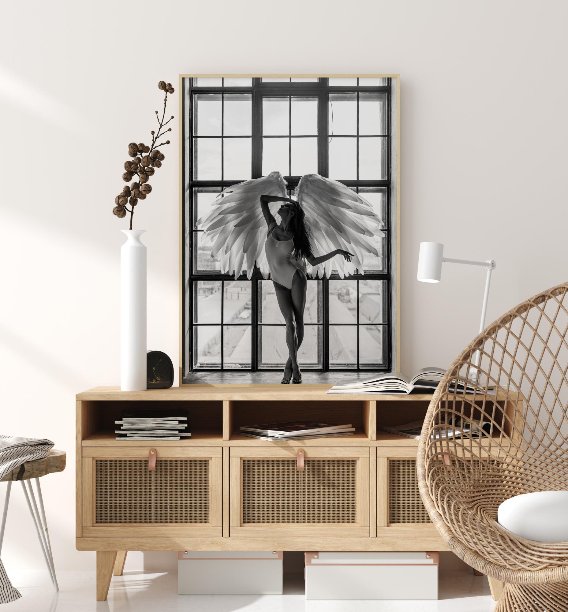 Un magnifique poster d'art photographique en nuances de gris foncé représentant une femme posant dans une grande fenêtre, vêtue d'un body et de grandes et belles ailes d'ange. Un poster facile à combiner avec d'autres favoris, mais qui se prête également bien comme unique point de mire.