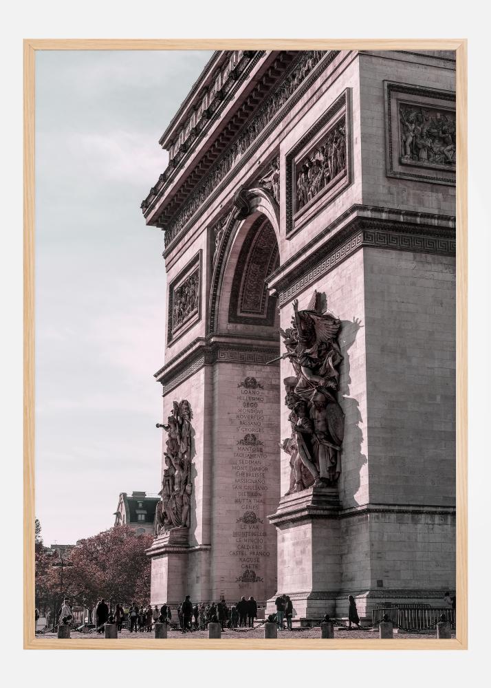 Cette élégante affiche met en valeur l'architecture majestueuse et détaillée de l'Arc de Triomphe à Paris. Dans cette impression unique, la grandeur et la richesse en détails du célèbre monument sont capturées, des puissantes sculptures qui décorent ses piliers aux fines décorations et inscriptions qui racontent son importance historique. Avec une teinte légèrement rose qui crée une atmosphère chaleureuse, cette image est un hommage à l'histoire et à l'architecture françaises, et devient un ajout cultivé à toute collection d'art et d'affiches.