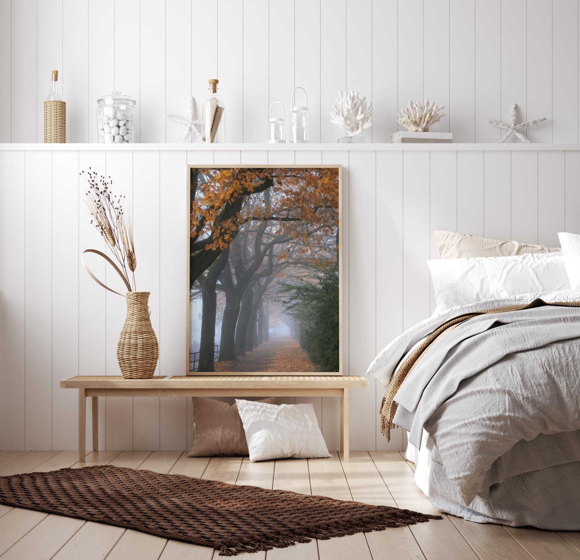 Une affiche nature incroyable représentant un chemin passant devant de grands arbres matures. À gauche, d'épais troncs d'arbres et des feuilles orange atteignent le ciel. À droite, les conifères verts contrastent avec les feuilles caduques rouges. De la brume s'échappe au loin, créant une sensation de fraîcheur et apportant la grandeur de la nature dans votre maison.
