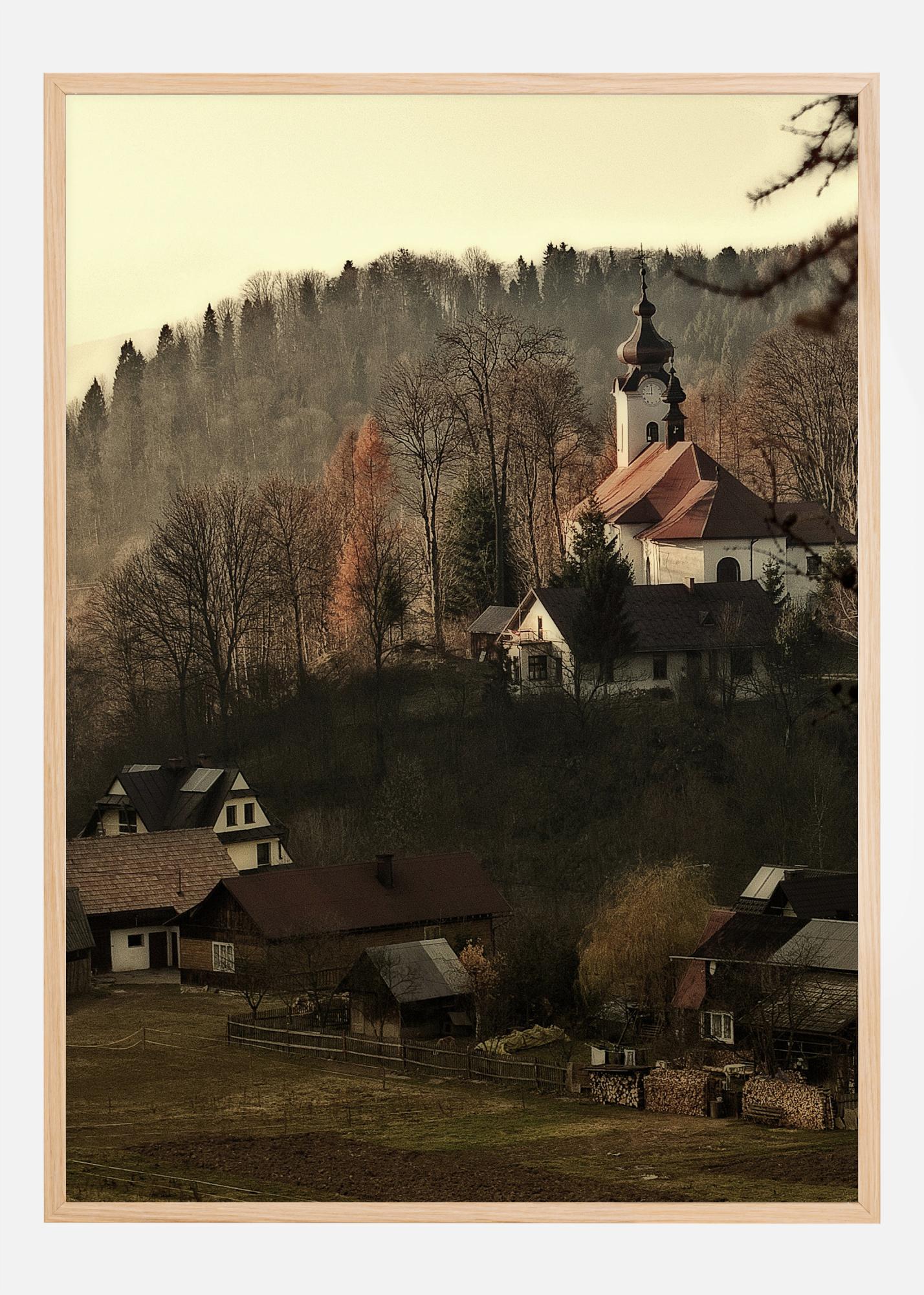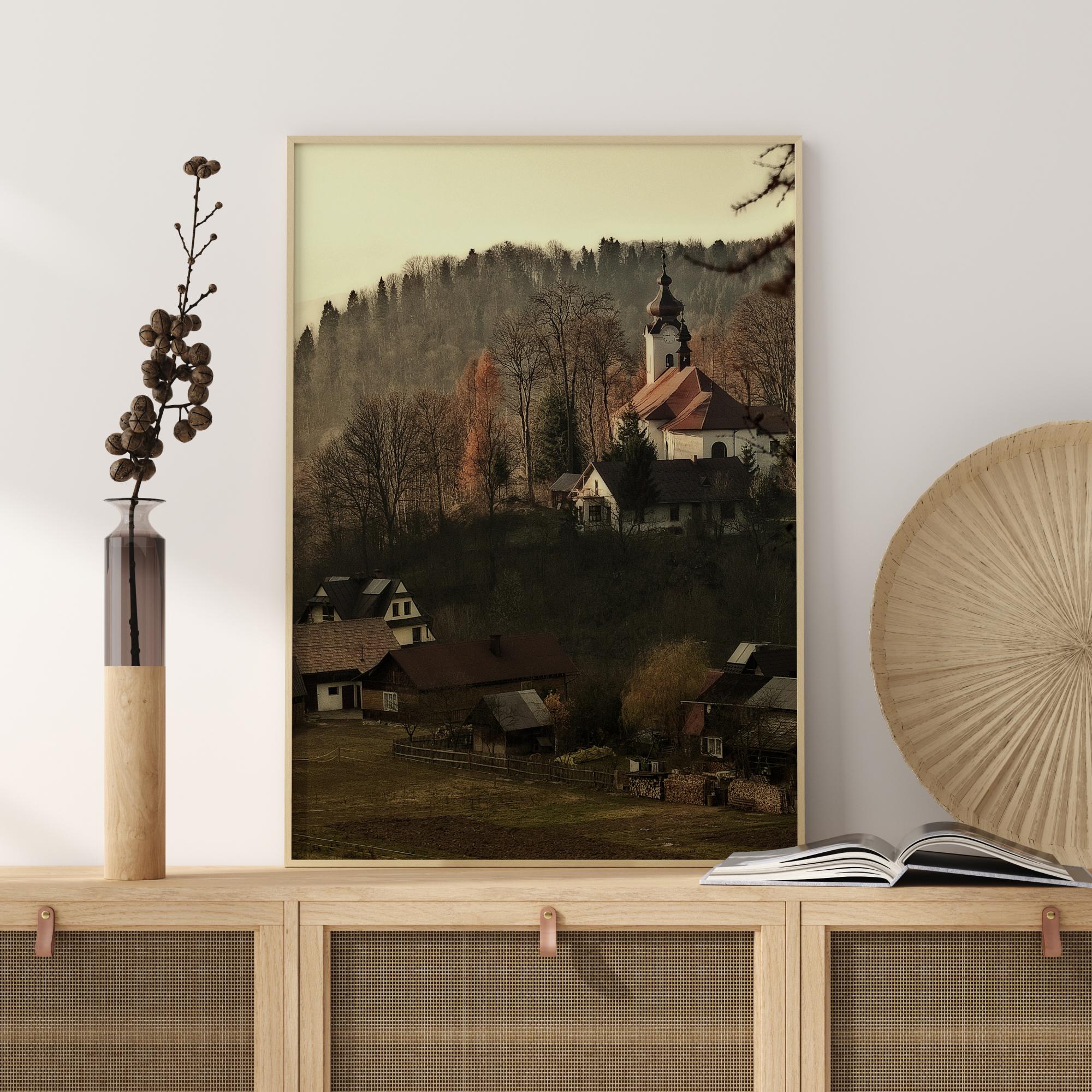 Une affiche de paysage d'un petit village rural avec de vieilles maisons et des champs avec des collines couvertes d'arbres derrière. Un clocher blanc se dresse sur les bruns et les verts sourds du paysage. Plongez dans ce village pittoresque en ajoutant ce poster à votre mur.