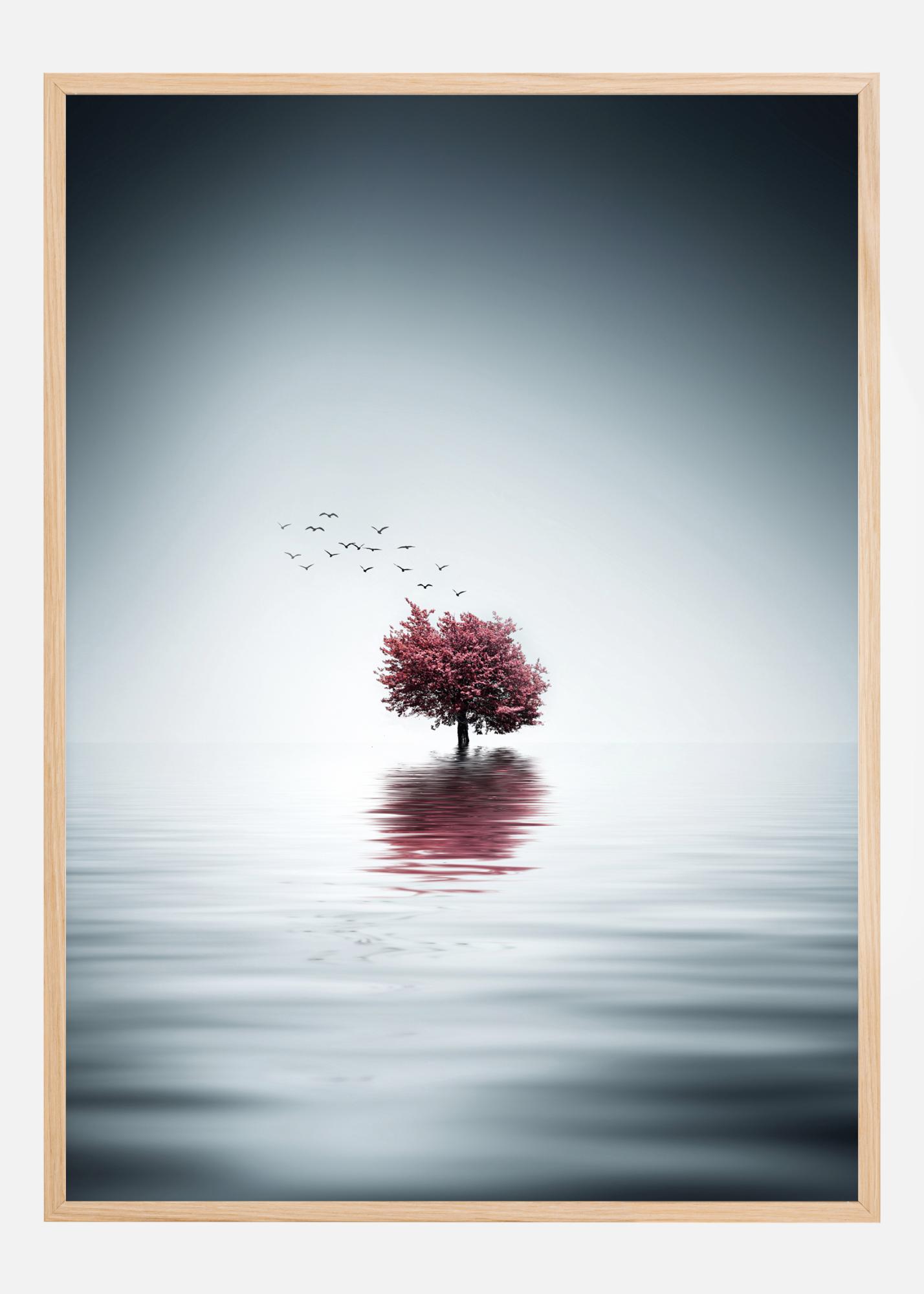 Une affiche nature simple représentant un lac avec un arbre solitaire au milieu. Les couleurs vives et les ondulations conduisent le regard vers le petit cerisier rose vif en fleur. Une volée d'oiseaux s'envole dans un halo de lumière. Vous pouvez ressentir la nature mystérieuse de ce monde.