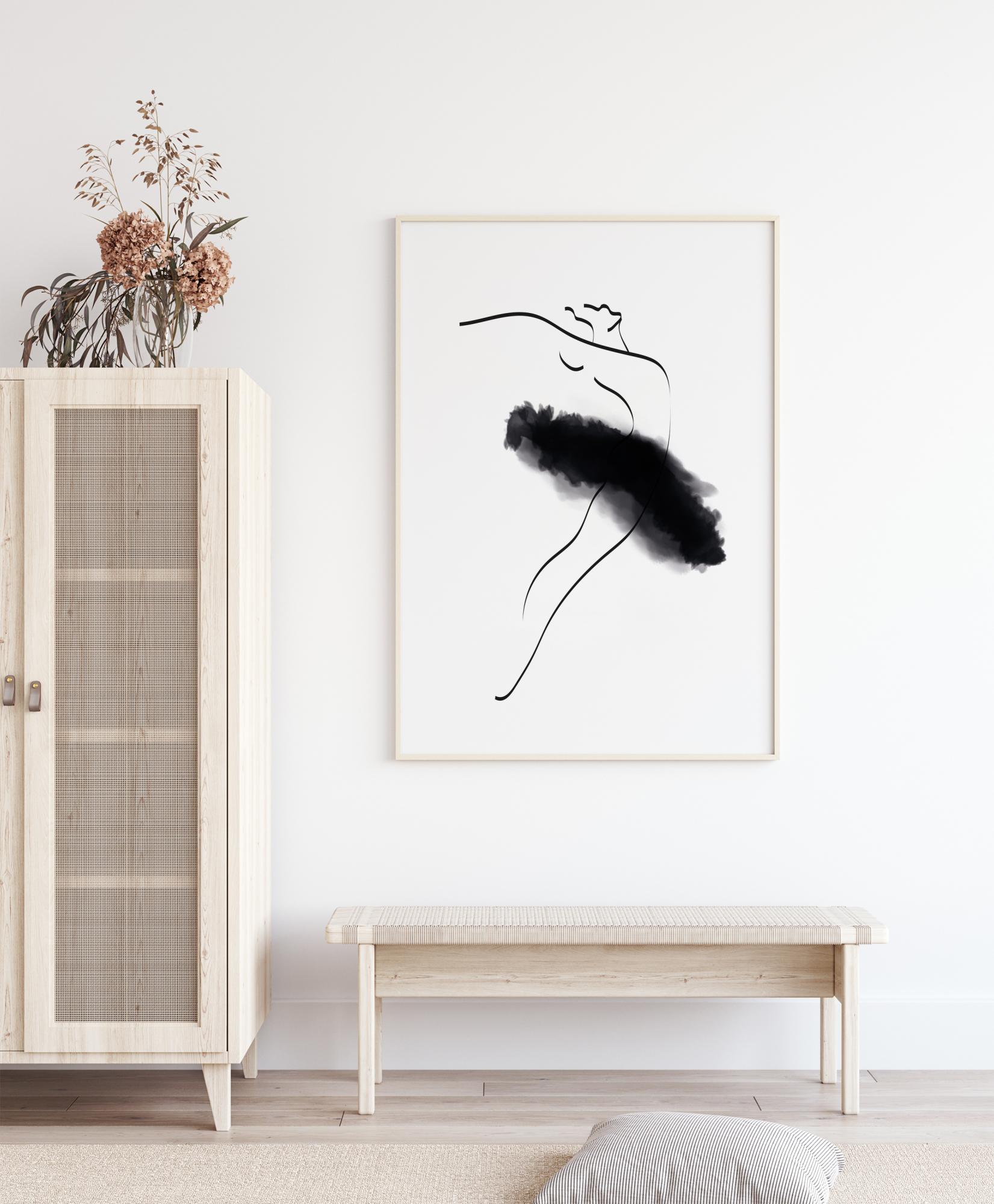 Une aquarelle d'une ballerine en fines lignes noires avec une jupe de ballerine noire plus prononcée. Un poster minimaliste et élégant qui convient aussi bien dans la chambre ou le couloir, que dans le salon ou la bibliothèque.