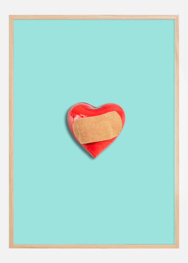 Cette affiche stimulante montre un cœur rouge avec un pansement, sur un fond turquoise apaisant. La symbolique est forte et ouverte à interprétation, que ce soit pour guérir un cœur brisé ou prendre soin de nos blessures émotionnelles. Le contraste vibrant entre le cœur rouge et le fond apaisant donne à l'image une résonance profonde et émotionnelle.