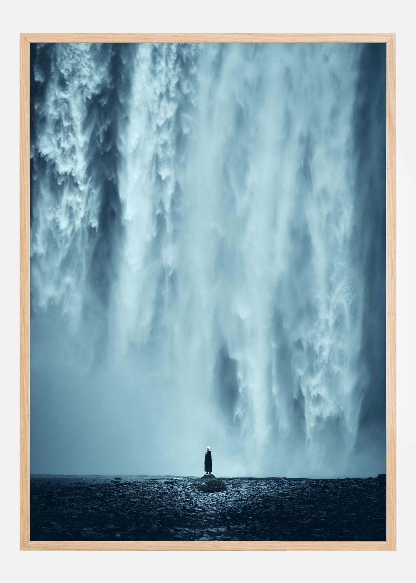 Une affiche épique montrant la force stupéfiante de la nature lorsqu'une chute d'eau s'écrase. Le drame est à son comble lorsqu'un petit personnage noir au centre de l'image regarde fixement l'eau qui tombe en cascade. La chute d'eau bleue et blanche évoque un sentiment d'émerveillement dans ce cliché magnifique.